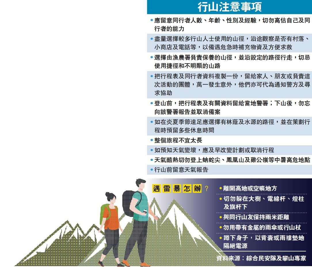 攀山專家呼籲行山人士切勿在雷暴下登山,遇行雷閃電,應盡快離開高地或空曠地方,並關掉手機、除下眼鏡、手錶及頸鏈等可導電金屬物。