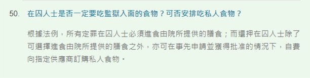 根據香港懲教署規定,所有定罪在囚人士必須進食由監獄提供的膳食;而還押在囚人士除了可選擇進食由監獄提供的膳食之外,也可在事先申請並獲得批准的情況下,自費向指定供應商訂購私人食物。