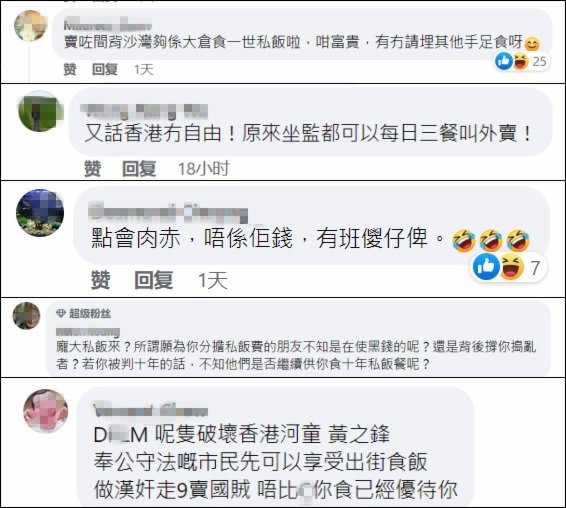 有網友指出,沒定罪期間都可以叫外賣,說香港「無自由」的言論這下不攻自破,更有人諷刺黃之鋒還押期間派頭多多還稱「心疼」錢簡直是假惺惺,「怎麼會心疼,又不是他錢,有群傻孩子出」。