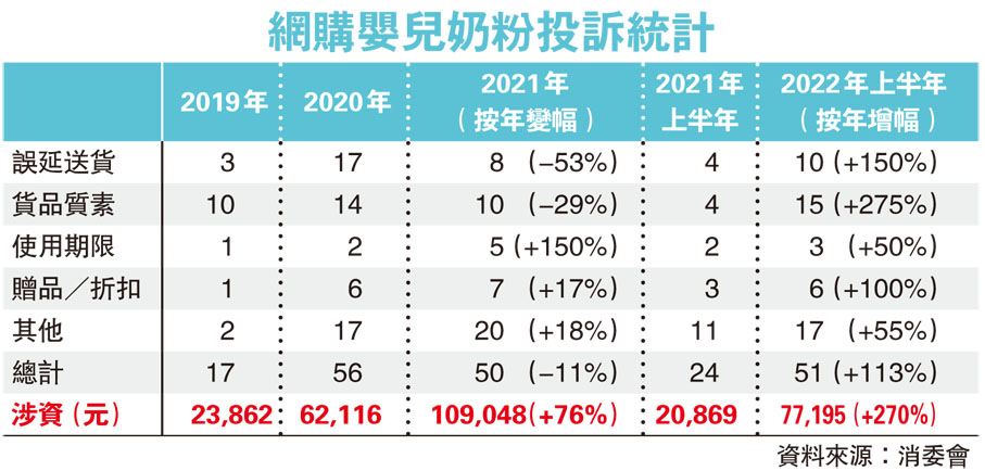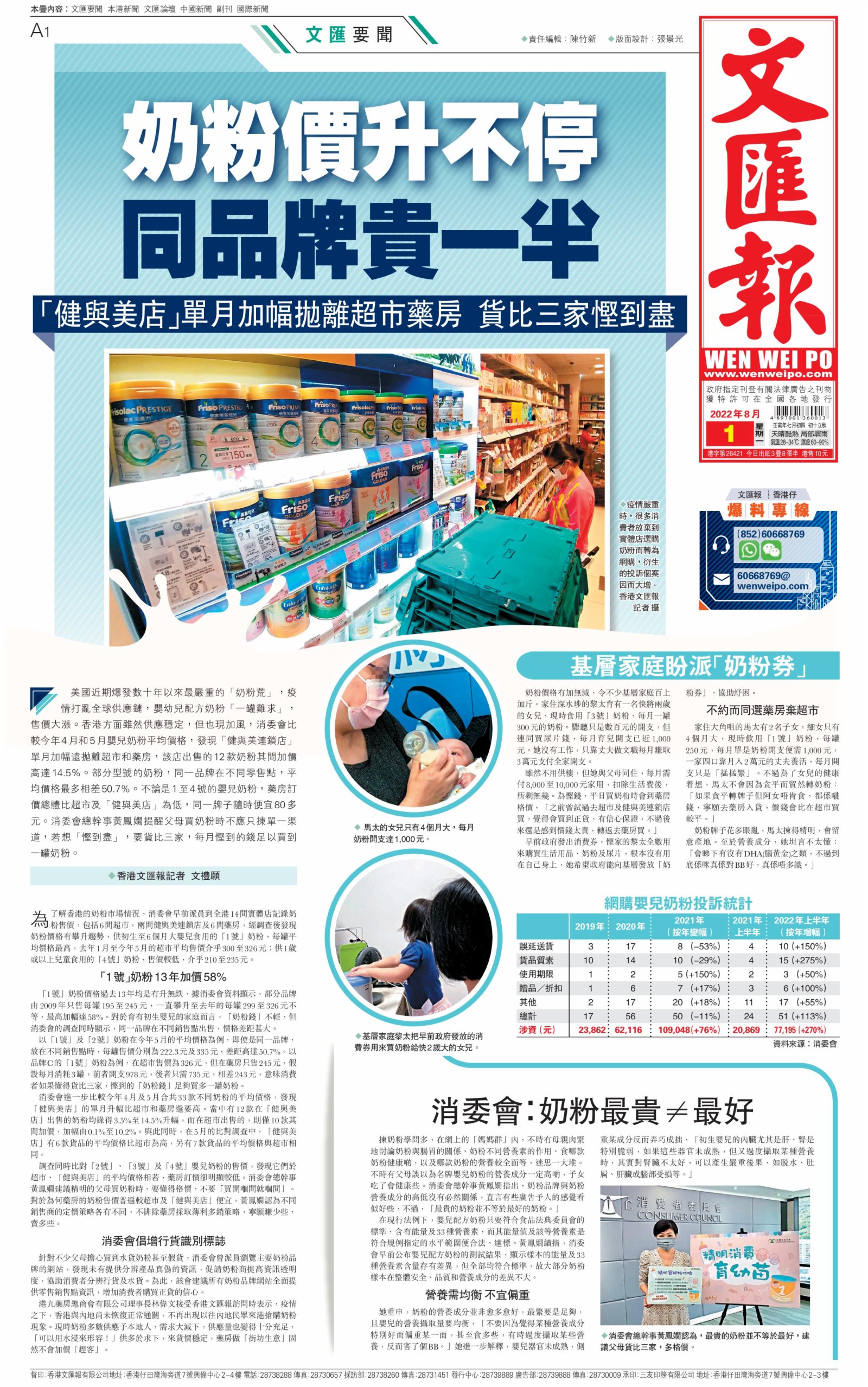 「1號」奶粉價格過去13年均是有升無跌,據消委會資料顯示,部分品牌由2009年只售每罐195至245元,一直攀升至去年的每罐299至326元不等,最高加幅達58%。對於育有初生嬰兒的家庭而言,「奶粉錢」不輕,但消委會的調查同時顯示,同一品牌在不同銷售點出售,價格差距甚大。