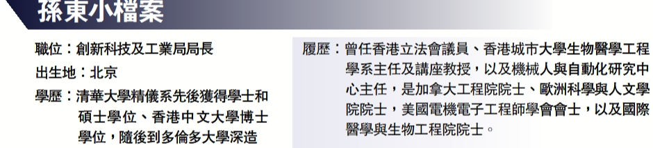 從大學教授到立法會議員,再成為創新科技及工業局局長,兩年內轉換兩次賽道,孫東說,當時出來參選立法會議員是形勢發展的需要,「在這個新選舉制度下,我們這個業界就需要有人出來,大家就推我出來。」後來擔任創工局局長,亦是形勢需要。「像當時我大學裏的二十多個學生要轉給其他同事,他們也對這變化不太適應;現在到政府來,我所有的學術工作都停了。但是香港需要這樣一個人出來做事,我就不能考慮太多。」