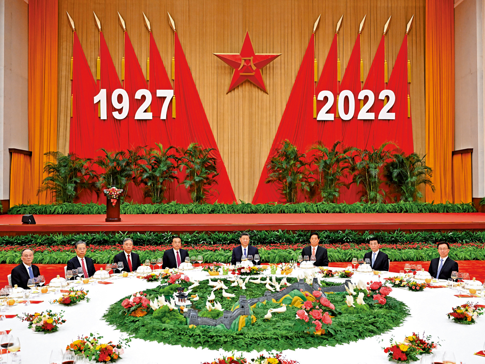人民大會堂宴會廳燈火璀璨,洋溢着熱烈喜慶的節日氣氛。主席台上方懸掛着莊嚴的「八一」軍徽,「1927-2022」的大字年號在紅旗映襯下格外醒目,昭示着中國人民解放軍走過95年的光輝歷程。