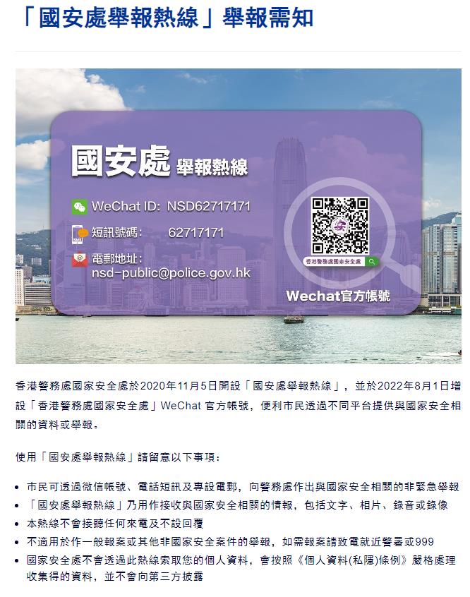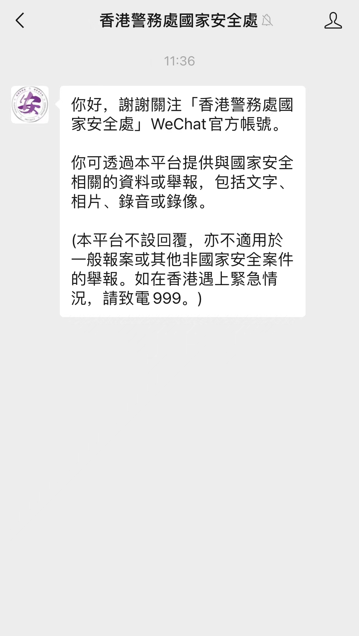 大公文匯全媒體報道,警務處國安處今日(8月1日)啟用微信公眾號,市民可作舉報。市民可在微信搜尋「香港警務處國家安全處」,關注官方帳號,獲取國家安全資訊。相關帳號並設有舉報功能,市民可直接提供或舉報與國家安全相關的資料。平台不設回覆,也不適用於一般報案或非國家安全案件。