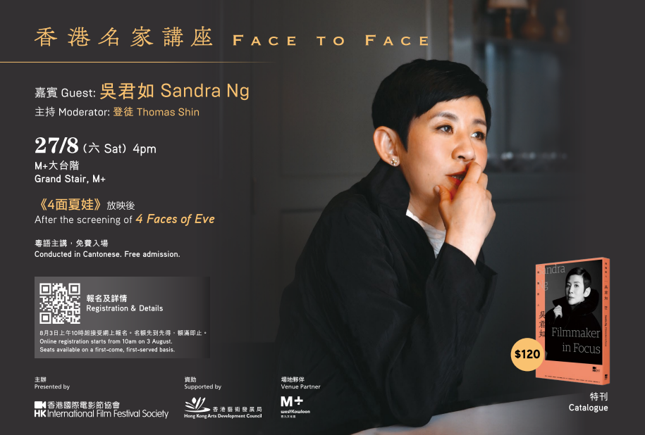 作為今屆焦點影人,吳君如以諧星形象深入人心。她二十歲踏足電影圈,演過不少讓人印象深刻的角色,一邊是揮灑自如的喜劇:首先以黑馬之姿騎劫了《霸王花》,及後常在男性主導的喜劇中擔當諧星丑角;另一邊是耀目的可塑性發揮:自資製作《4面夏娃》毅然踏出轉型的神奇一步,是她日後探索自主與多元性別形象的濫觴。《古惑仔情義篇之洪興十三妹》中女生男相、剛柔並濟的演出贏得香港電影金像獎最佳女主角。本屆電影節重溫她的多部經典喜劇,既以笑忘憂,亦勵志互勉。8月27日(星期六)下午16時M+,《4面夏娃》放映後即是吳君如講座,觀眾可從8月3日免費進行網上報名。名額有限,先到先得。