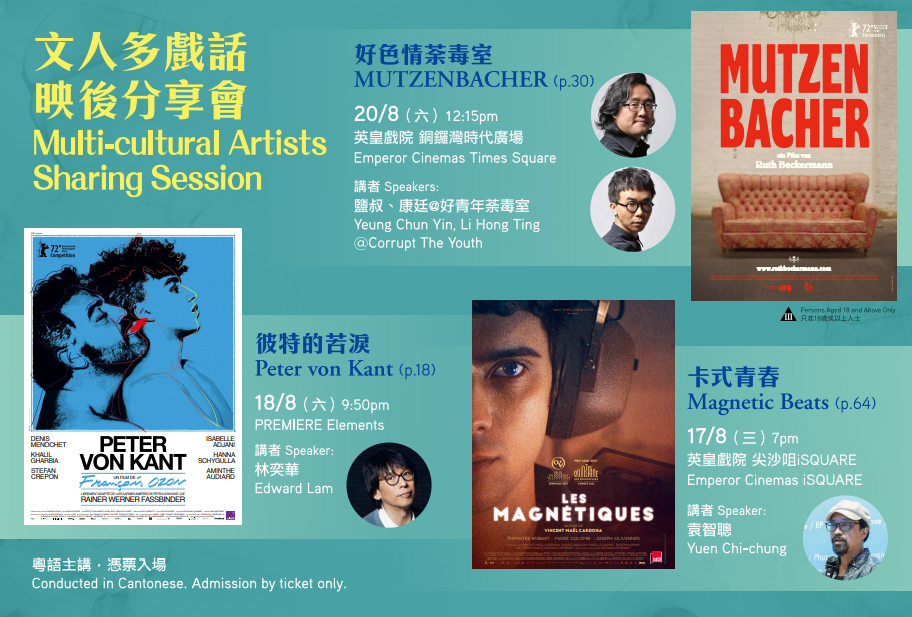 電影節亦設多場映後分享會,邀請鹽叔、康庭、林奕華、袁智聰等名家主講,涵蓋電影《好色情荼毒室》《彼特的苦淚》以及《卡式青春》。