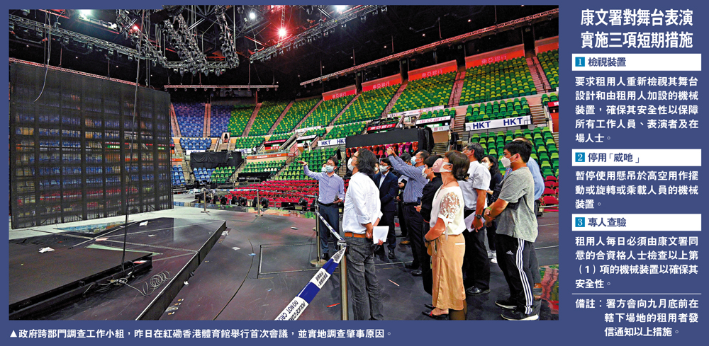 康文署昨晚宣布,在調查報告未完成之前,會重新審視署方轄下表演場地演出活動的安全,今日(2日)起實施三項短期措施,直至另行通知,以保障表演者及工作人員能在安全的情況下演出。措施包括要求租用人重新檢視舞台加設的機械裝置;暫停使用懸吊於高空用作擺動或旋轉、俗稱「威吔」的裝置;以及租用人每日必須由康文署同意的合資格人士檢查機械裝置。