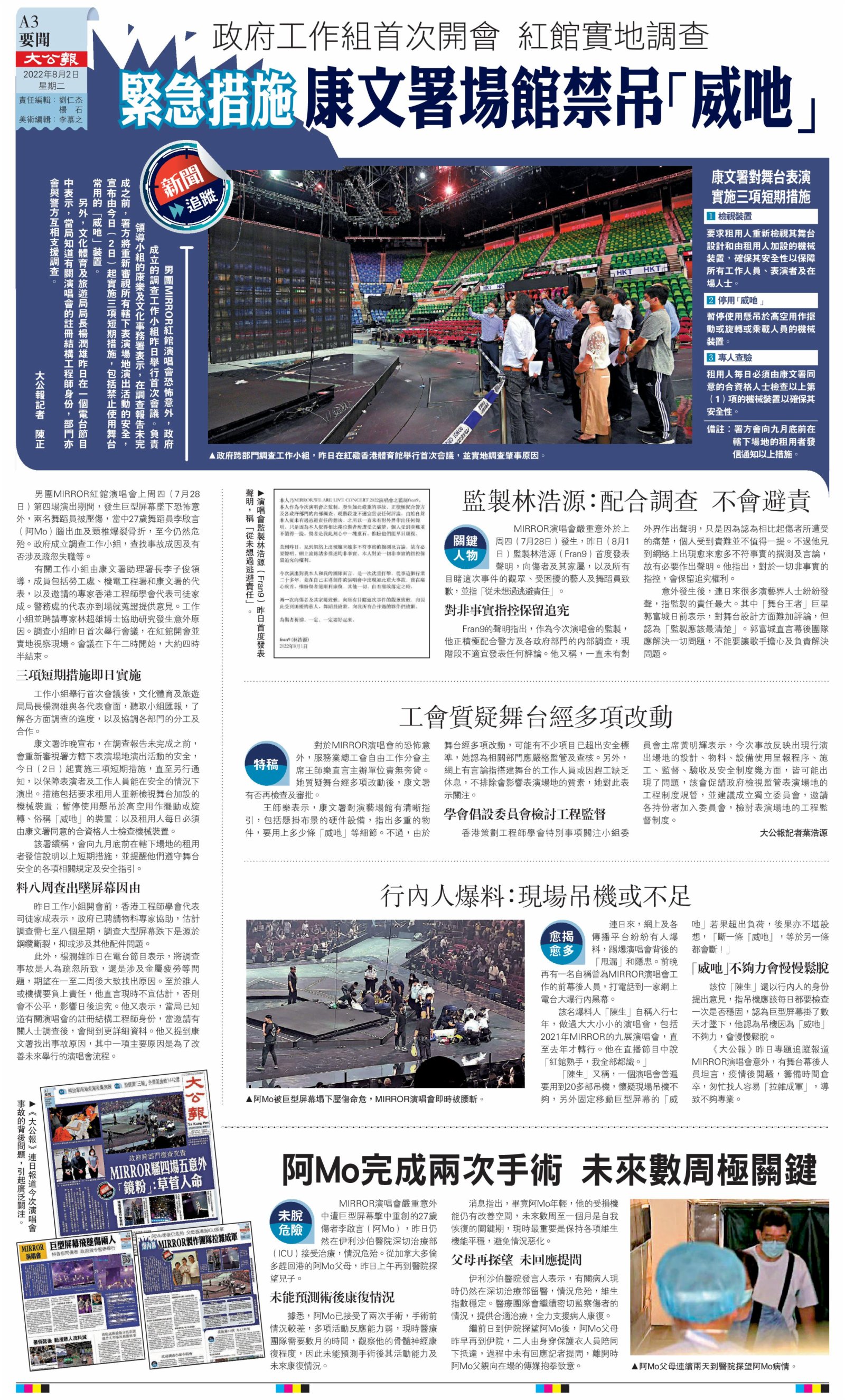 男團MIRROR紅館演唱會上周四(7月28日)第四場演出期間,發生巨型屏幕墜下恐怖意外,兩名舞蹈員被壓傷,當中27歲舞蹈員李啟言(阿Mo)腦出血及頸椎爆裂骨折,至今仍然危殆。政府成立調查工作小組,查找事故成因及有否涉及疏忽失職等。