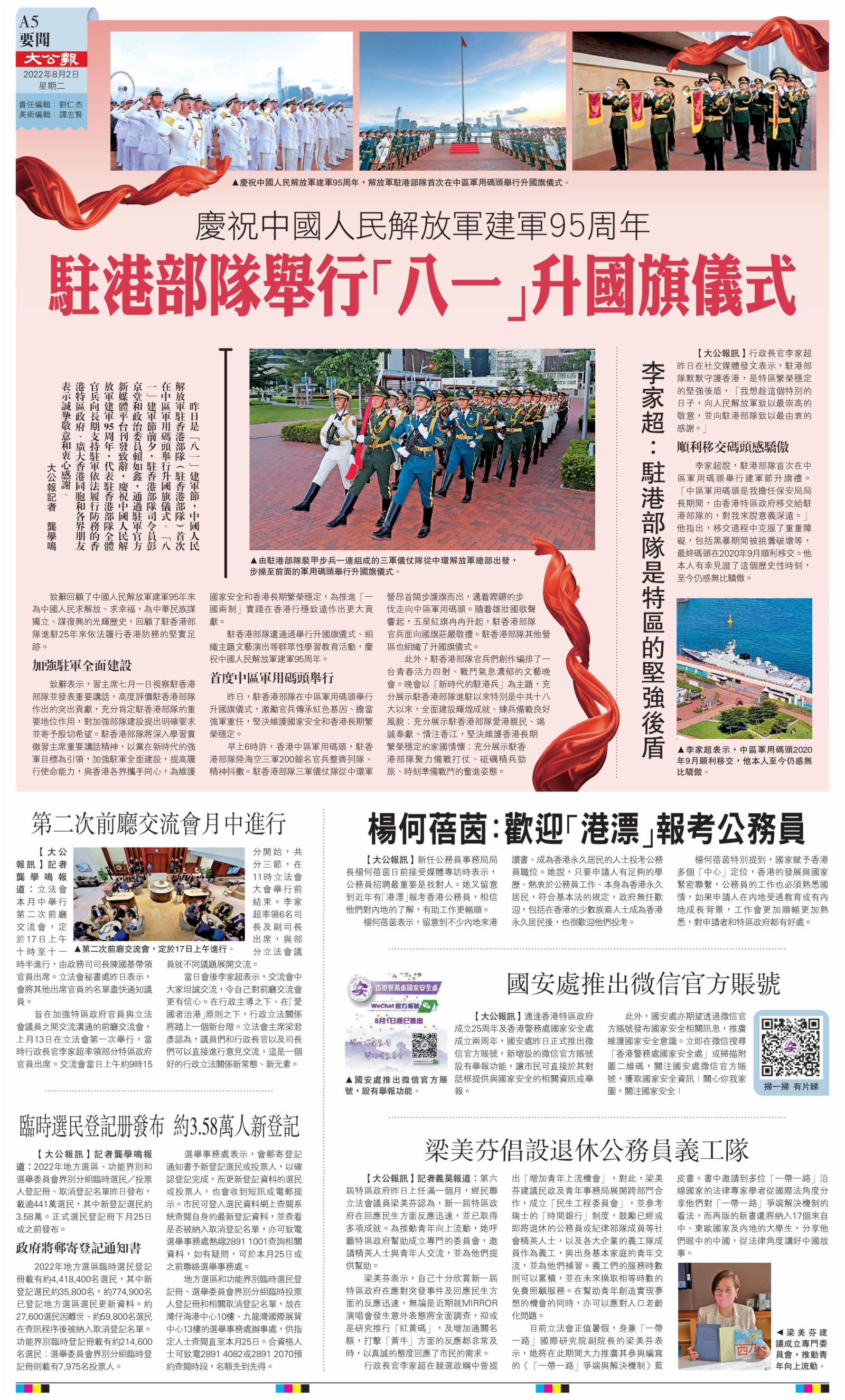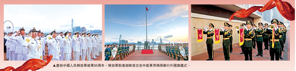 (大公報記者 龔學鳴)昨日是「八一」建軍節,中國人民解放軍駐香港部隊(駐香港部隊)首次在中區軍用碼頭舉行升國旗儀式。「八一」建軍節前夕,駐香港部隊司令員彭京堂和政治委員賴如鑫,通過駐軍官方新媒體平台刊發致辭,慶祝中國人民解放軍建軍95周年,代表駐香港部隊全體官兵向長期支持駐軍依法履行防務的香港特區政府、廣大香港同胞和各界朋友表示誠摯敬意和衷心感謝。