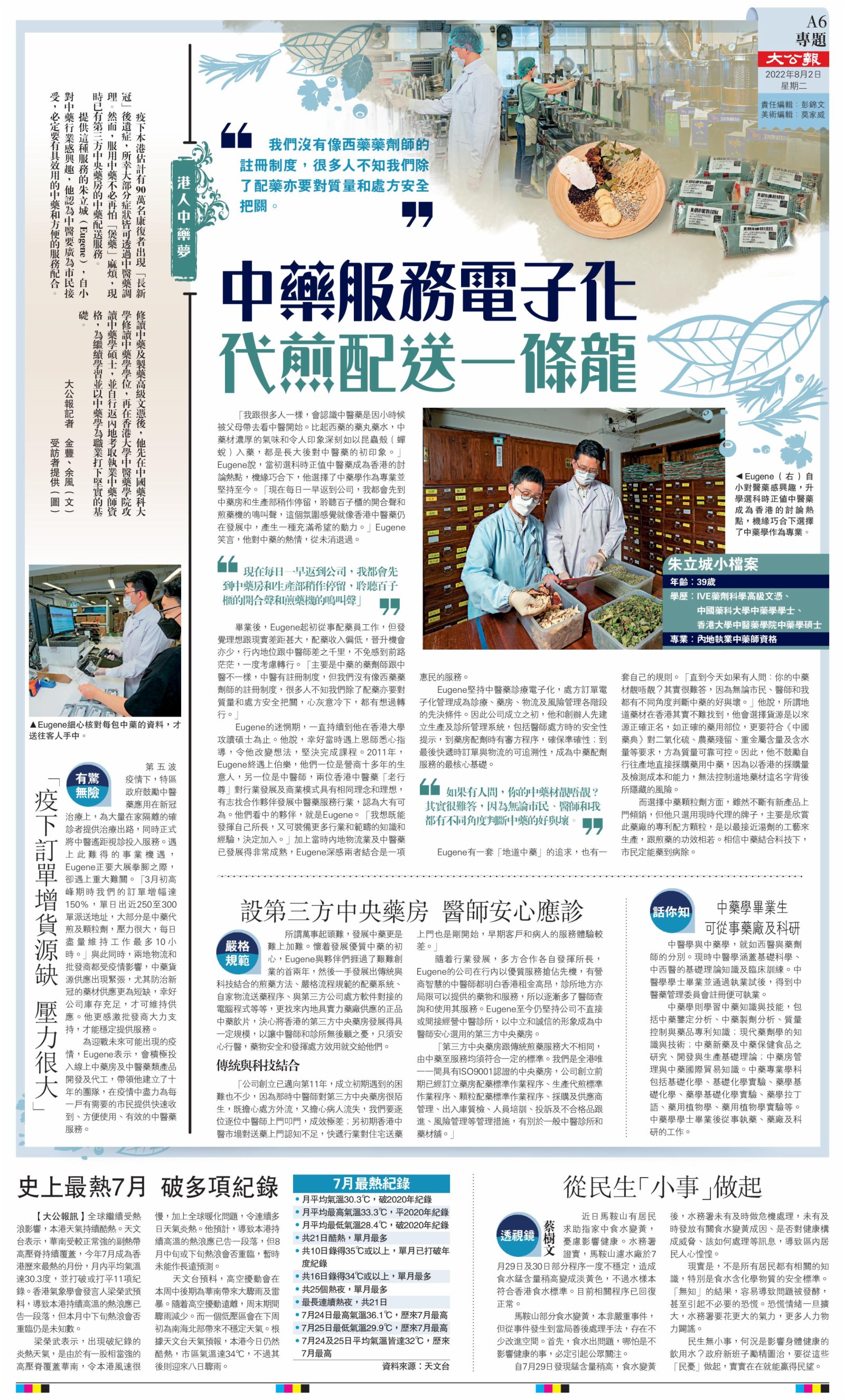 Eugene的迷惘期,一直持續到他在香港大學攻讀碩士為止。他說,幸好當時遇上恩師悉心指導,令他改變想法,堅決完成課程。2011年,Eugene終遇上伯樂,他們一位是營商十多年的生意人,另一位是中醫師,兩位香港中醫藥「老行尊」對行業發展及商業模式具有相同理念和理想,有志找合作夥伴發展中醫藥服務行業,認為大有可為。他們看中的夥伴,就是Eugene。「我想既能發揮自己所長,又可裝備更多行業和範疇的知識和經驗,決定加入。」加上當時內地物流業及中醫藥已發展得非常成熟,Eugene深感兩者結合是一項惠民的服務。