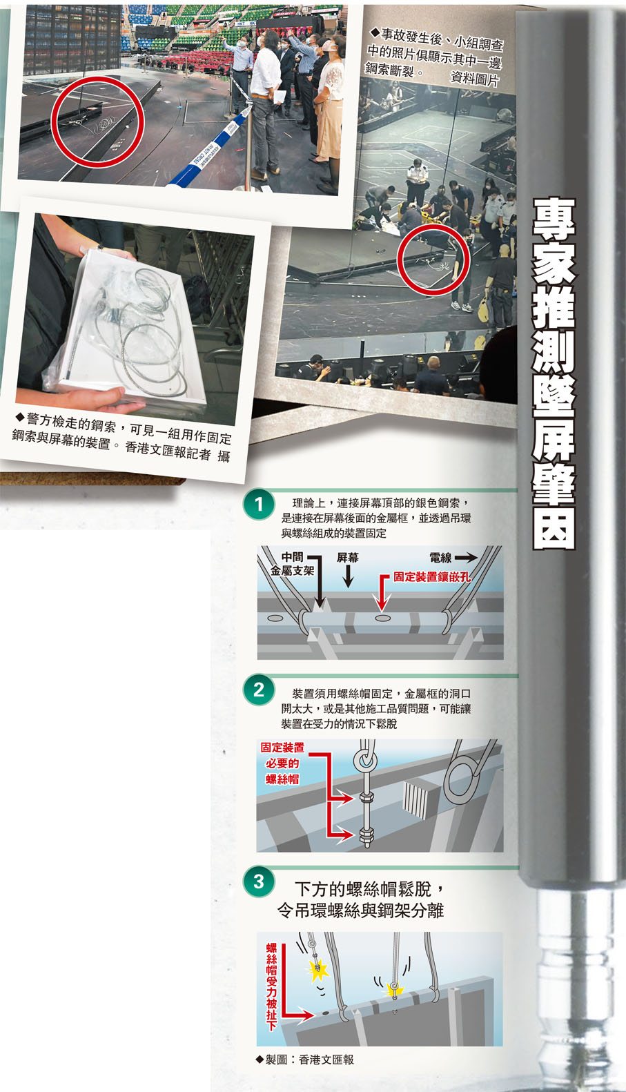 有消息指,根據事故當晚的相片及影片分析,發現墮下的LED巨型屏幕電線事後仍連接在屏幕上,而其中一條銀色的鋼索呈斷裂狀,連接在屏幕的金屬框架上,但屏幕另一邊的鋼索卻「消失」了,有分析指不排除是扣住鋼索與屏幕的裝置鬆脫造成事故。註冊結構工程師倪學仁估計有多個可能性,包括可能是下方的螺絲帽因施工品質問題鬆脫,令吊環螺絲與鋼架分離,以及或是金屬框的洞口開得過大,在受力情況下鬆脫。