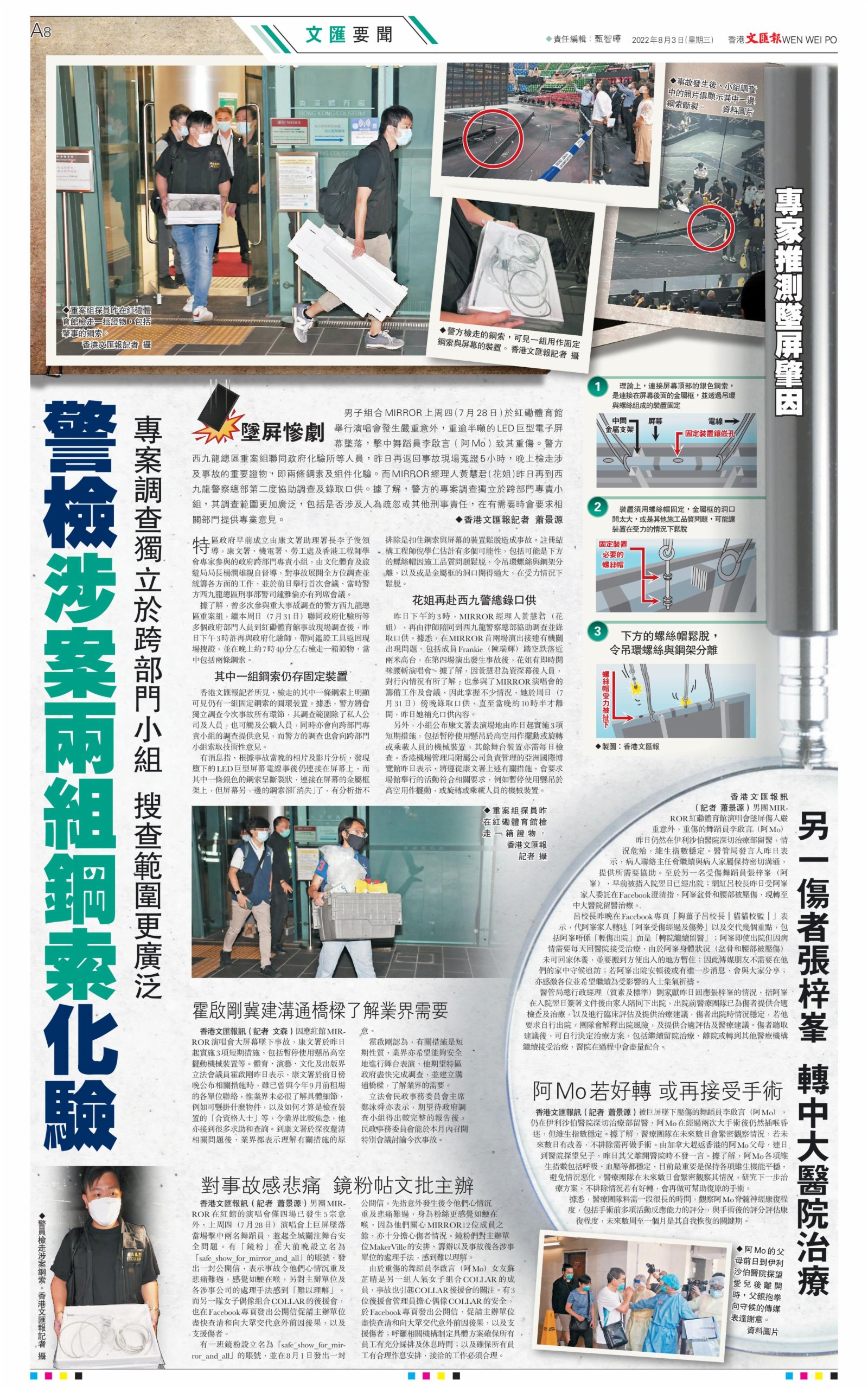 (香港文匯報記者 蕭景源 文森)男子組合MIRROR上周四(7月28日)於紅磡體育館舉行演唱會發生嚴重意外,重逾半噸的LED巨型電子屏幕墜落,擊中舞蹈員李啟言(阿Mo)致其重傷。警方西九龍總區重案組聯同政府化驗所等人員,昨日再返回事故現場蒐證5小時,晚上檢走涉及事故的重要證物,即兩條鋼索及組件化驗。而MIRROR經理人黃慧君(花姐)昨日再到西九龍警察總部第二度協助調查及錄取口供。據了解,警方的專案調查獨立於跨部門專責小組,其調查範圍更加廣泛,包括是否涉及人為疏忽或其他刑事責任,在有需要時會要求相關部門提供專業意見。