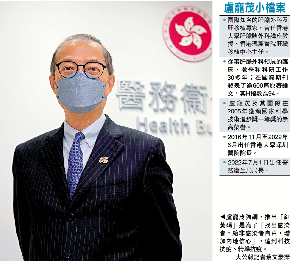 盧寵茂表示,期望盡快推出「紅黃碼」。「紅黃碼」制度目標清晰,紅碼是確保居家隔離的患者若走出社區,可以容易識別;而向入境旅客發黃碼,是容許適當縮短他們的檢疫酒店日數,可以回家做部分活動,但限制除口罩的活動,不會為社區帶來傳播風險。他說,在安心出行程式內的「紅黃碼」已進入測試階段,「確保應紅就紅,應黃就黃,應不紅不黃,就不紅不黃,正常的,一定要做得好」。