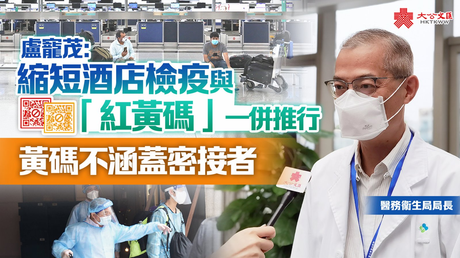 大公文匯全媒體報道,特區政府早前表示「安心出行」將引入「紅碼」「黃碼」制度。醫務衞生局局長盧寵茂近日接受訪問時表示,縮短抵港人士酒店隔離檢疫日數的安排將配合「紅黃碼」一併推行,當中「黃碼」只適用由海外及台灣抵港人士,「紅碼」則代表新冠確診者。