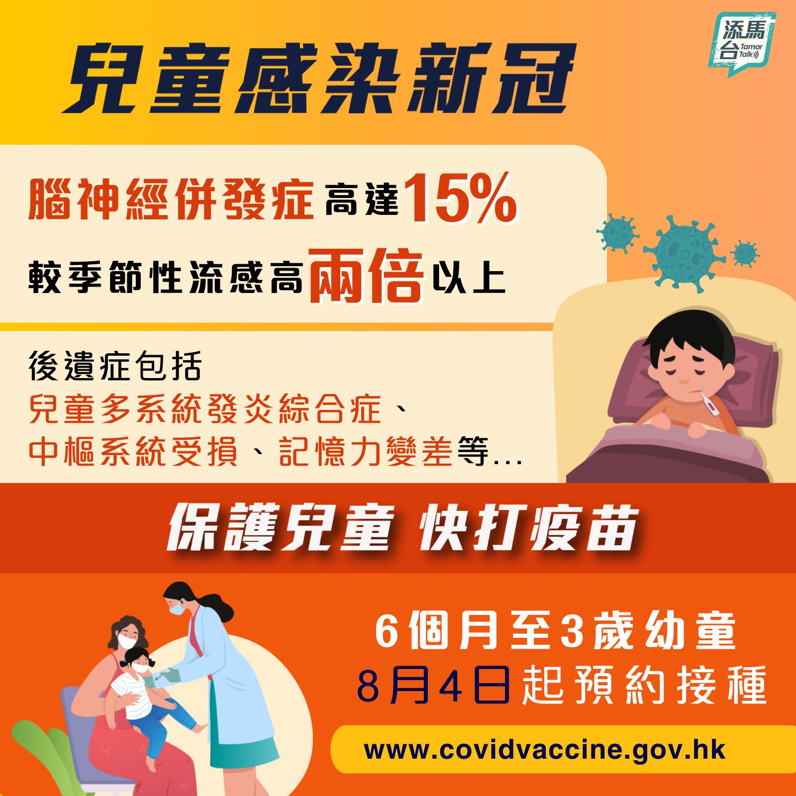 政府指,根據香港大學研究,11歲以下兒童感染新冠,腦神經併發症包括腦炎風險達15%,較季節性流感高兩倍或以上。其他後遺症更包括兒童多系統發炎綜合症,以及「長新冠」症狀如中樞系統受損、記憶力變差和失眠等。而科學數據證實新冠疫苗有效減低染疫後患重症、死亡,或出現嚴重後遺症的風險,呼籲家長應盡早為年幼子女接種疫苗以作保護。