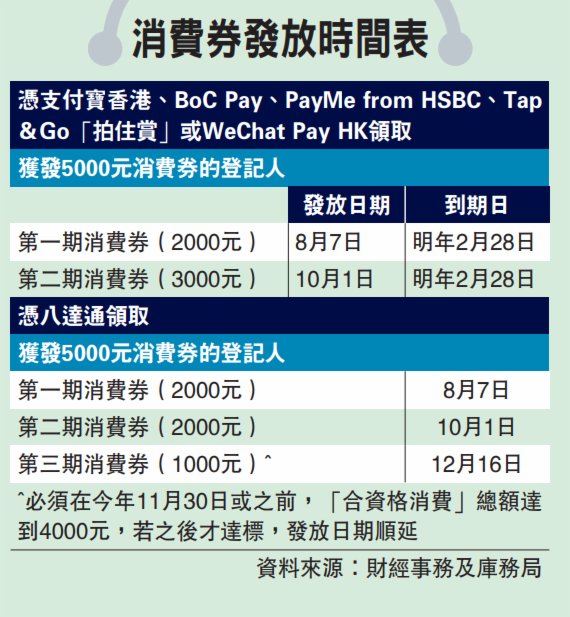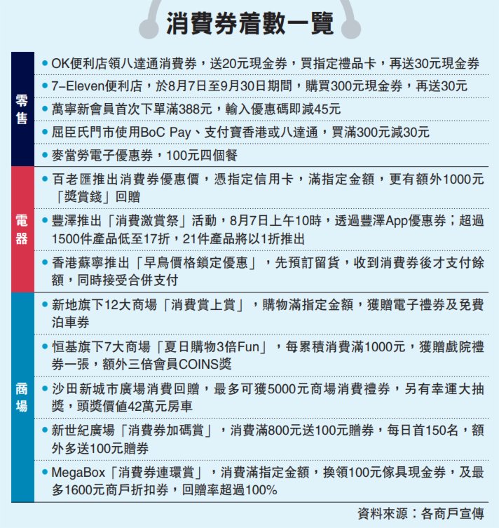 跟過往一樣,市民當日可以直接經支付平台領取,八達通卡持有人則可透過補貼領取站、應用程式、指定超市或便利店獲得。OK便利店表示,凡首次以八達通成功領取第二階段首期2000元消費券,將額外獲贈20元OK現金券;至於7-Eleven便利店,於8月7日至9月30日期間,購買300元現金券亦將送30元。