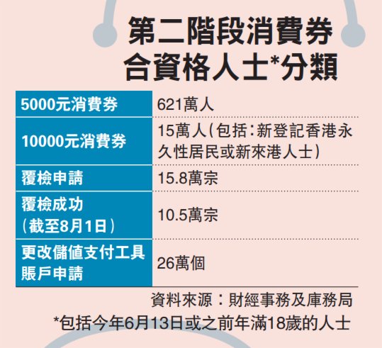 政府發言人昨日表示,其餘5.4萬宗覆檢個案仍在處理,秘書處在收到申請後六周內,將以短訊通知覆檢結果,若覆檢成功,相關人士最快可於8月16日收取首期消費券。
