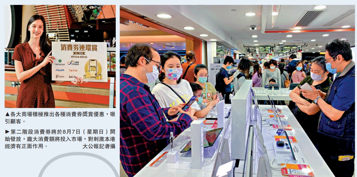(大公報 記者 賴振雄、林惠芳)第二階段五千元消費券,第一期將於8月7日(星期日)發放,621萬人獲發首期二千元;另外,15萬名新登記及新來港人士將分期獲得一萬元,首期先領取三千元。各零售店、食肆和商場近日紛紛加推優惠吸客,包括折扣價購物、優惠券回贈和大抽獎等。有飲食業界人士估計,消費券派發可以為業界帶來小陽春,料持續一個月,生意可望增加一成。