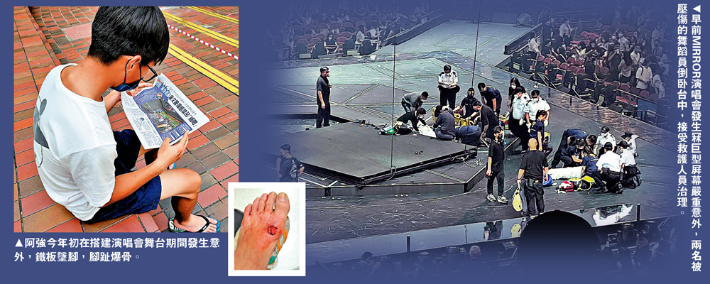 (大公報 記者 李雅雯、李斯達)MIRROR演唱會巨型屏幕墜落擊傷舞蹈員李啟言(阿MO)事件,西九龍重案組、文化體育及旅遊局局長楊潤雄督導的調查小組展開深入調查,調查結果未公布前,三間承辦商藝能工程有限公司、協興隆舞台工程有限公司及In Technical Productions(ITP),哪間公司責任最大?意外事故是否涉及人為疏忽等眾說紛紜。《大公報》訪問協興隆舞台工程公司前僱員阿強,講述業界員工受傷欠保障及舞台安全的漏洞。