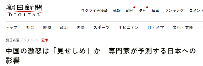 日本《朝日新聞》評價解放軍的軍演行動為「強烈的反擊」。「在中國看來,美國和台灣地區持續對台海局勢作出挑釁,無論是美國高管竄訪台灣,還是美國向台灣出售武器,在中國大陸看來都是不間斷的挑釁。」「大陸此番反擊,不單單是針對佩洛西竄台一事,而是對美國、台灣地區迄今為止一系列行為的對抗。」