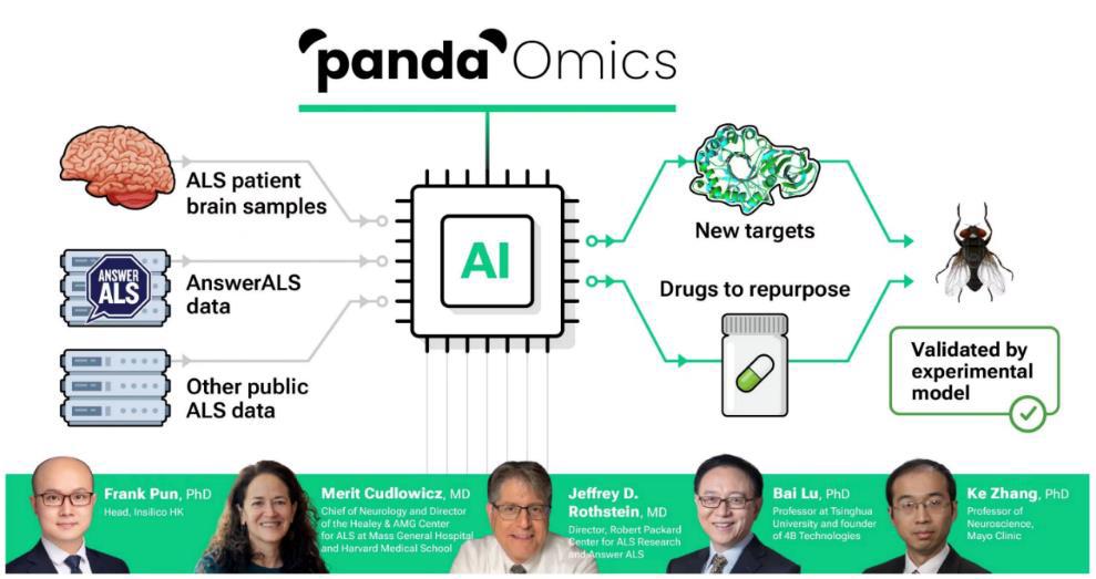 研究團隊透過龐大的數據庫尋找與漸凍症相關的基因,作為新療法的潛在靶點。由英矽智能自主研發、以人工智能驅動的靶點發現平台PandaOmics™,分析了來自公共數據庫的中樞神經系統(CNS)樣本表達譜,以及來自Answer ALS項目的由誘導性多功能幹細胞分化成的運動神經元(diMN)表達譜。