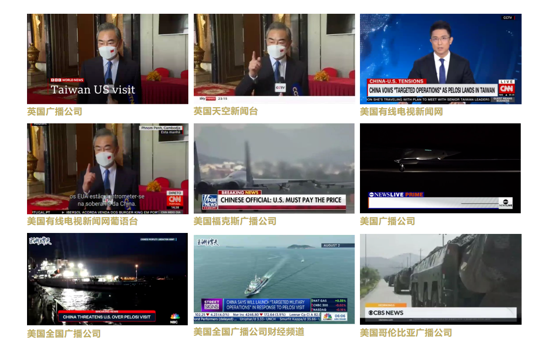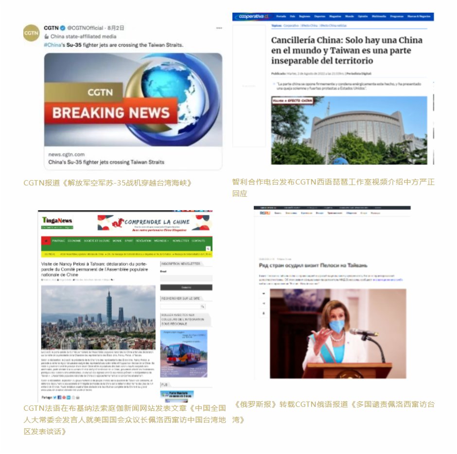 總台國際視頻通訊社聚焦外交部、國台辦、東部戰區等權威表態,可視化製作編髮《國際銳評》《玉淵譚天》等相關評論言論。截至8月4日10時,共有84條新聞素材得到BBC、CNN、CNBC、英國天空新聞台、法國24台、法國電視台、法國新聞台、德國電視一台、德國電視二台、德國之聲、意大利廣播電視公司、意大利TGCOM24電視台、加拿大廣播公司、加拿大最大的商業電視網CTV、俄羅斯第一頻道、全俄國家電視廣播公司、日本NHK、韓國KBS、巴西環球電視台、印度國家電視台、新加坡亞洲新聞台、澳大利亞廣播公司、卡塔爾半島電視台、墨西哥阿茲特克電視台、印尼國家廣播電視台等102個國家和地區的1683個電視台及新媒體平台採用。