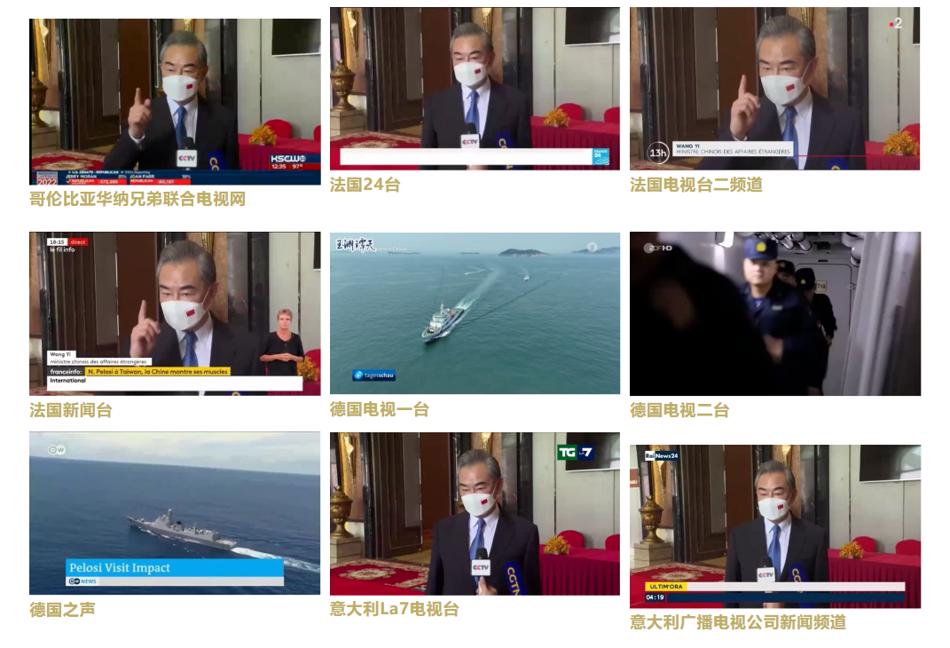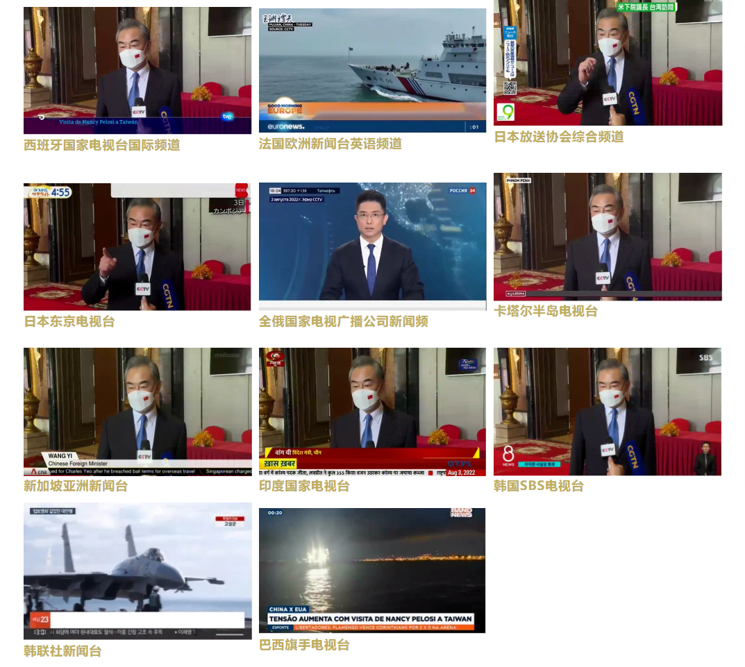 總台亞非中心製作的外交部、全國人大常委會、中共中央台灣工作辦公室、全國政協外事委員會、國防部、東部戰區、王毅國務委員兼外長發表的相關聲明和談話得到了日本、韓國、印度、土耳其、印尼、伊朗等對象國250多家主流媒體轉載近5000篇次。