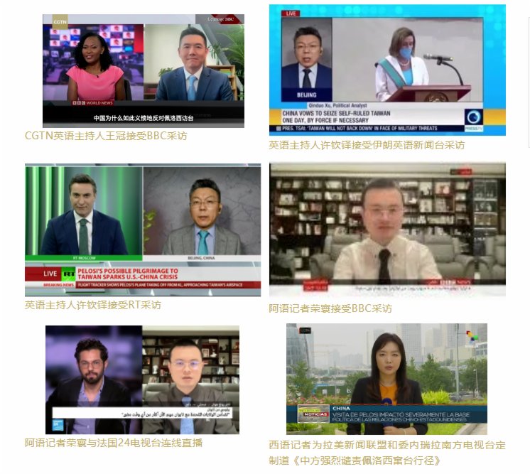 總台多語種主持人、評論員和網紅積極走向全球多個主流媒體的台前,通過視頻連線、撰寫稿件、接受採訪、參與節目以及在海外社交平台發聲等形式,強調中國立場,闡釋中國採取相關反制措施的合理性和必要性,揭批佩洛西等美政客的虛偽嘴臉,向國際輿論場發出有理有節、有力有效的中國聲音。