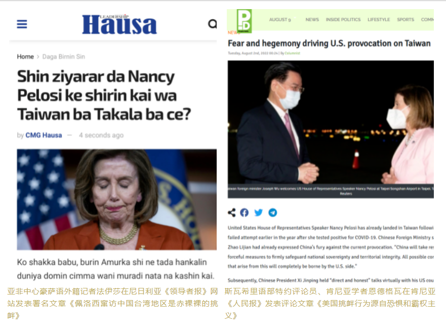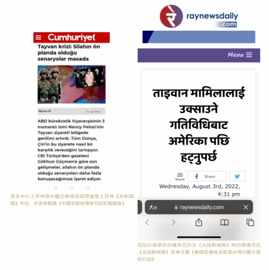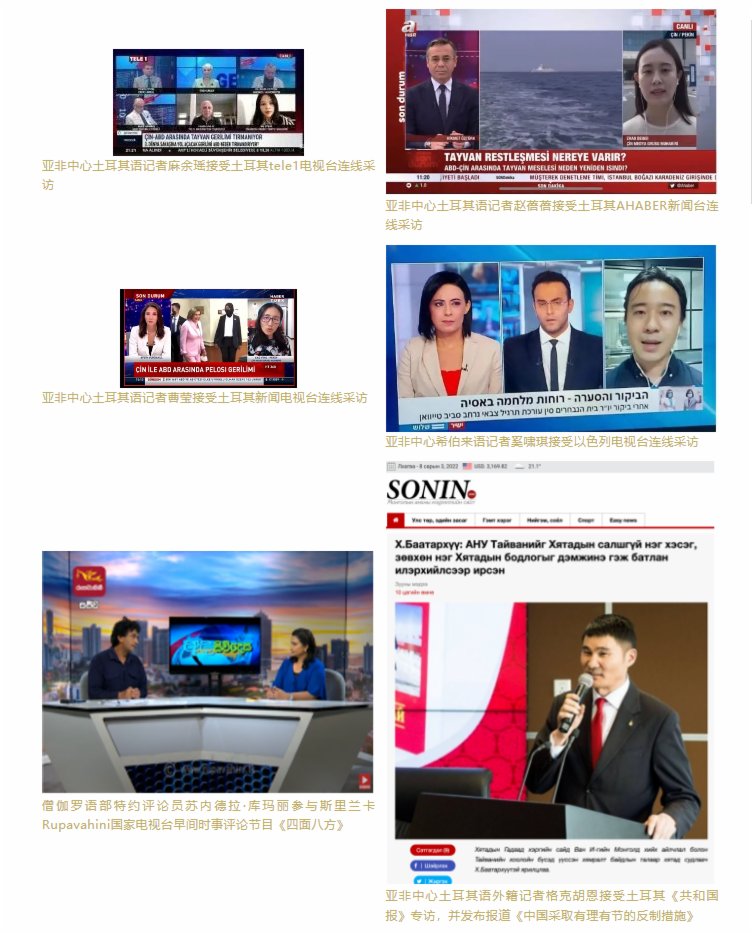 亞非中心土耳其、希伯來語、豪薩語、尼泊爾語、蒙古語等多語種主播、評論員和網紅積極在多家外媒發聲,接受了包括以色列電視台、土耳其AHABER新聞台、土耳其TGRT電視台、土耳其新聞電視台等多家國際媒體的採訪連線,同時多名外籍記者、海外特約評論員在尼日利亞《領導者報》網站、尼泊爾《光線新聞網》、肯尼亚《人民報》、蒙古國媒體SONIN.MN等對象國主流媒體發表評論及署名文章,對外闡釋中方立場和反制措施的合理性、正當性,介紹台灣問題歷史經緯,揭批美國在台灣問題上的背信棄義。