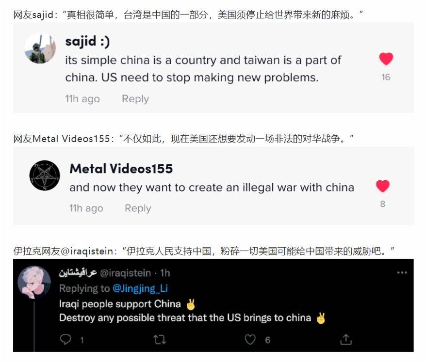 CGTN英、西、法、阿、俄等多語種主播、評論員和網紅積極在多家外媒發聲,接受了包括英國廣播公司(BBC)、今日俄羅斯(RT)、伊朗英語新聞台(Press TV)、拉美新聞聯盟、貝寧E-TELE電視台、法國24電視台、沙特阿拉比亞電視台以及以色列i24news電視台等多家國際媒體的採訪連線,主動闡釋中方立場,分析佩洛西這一挑釁行徑背後的虛偽動因,揭批美國在台灣問題上「說一套做一套」、侵犯中國的主權和領土完整的行為。