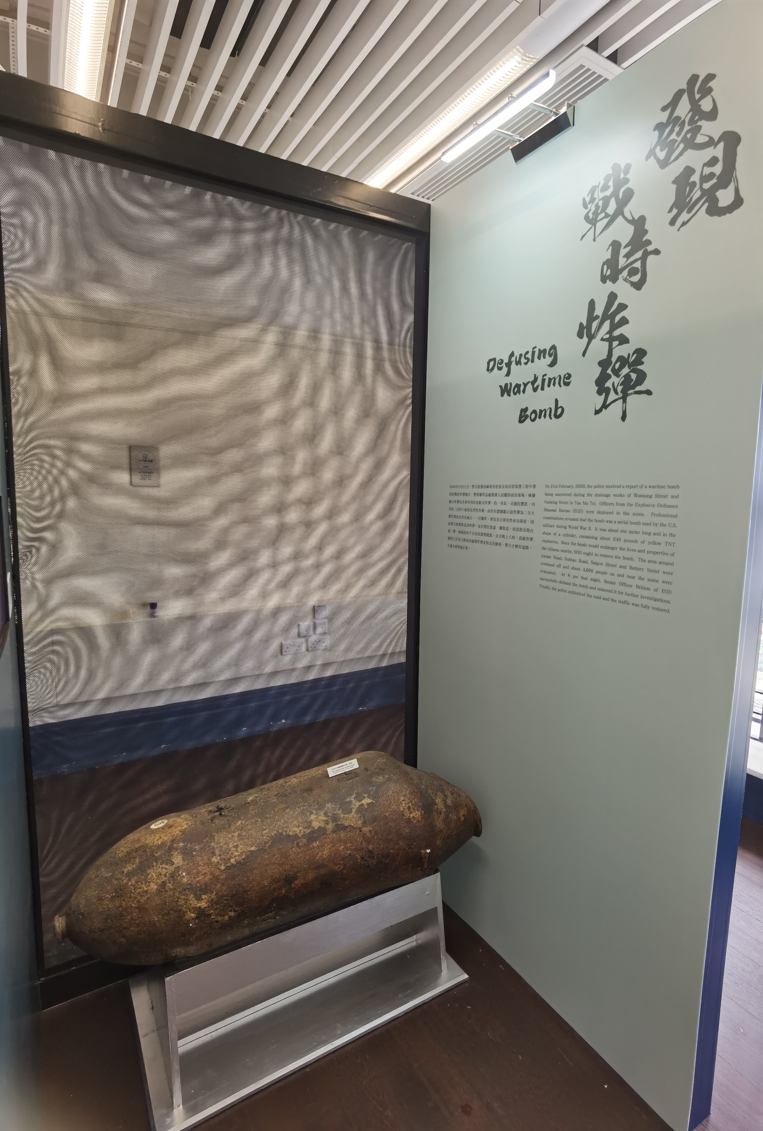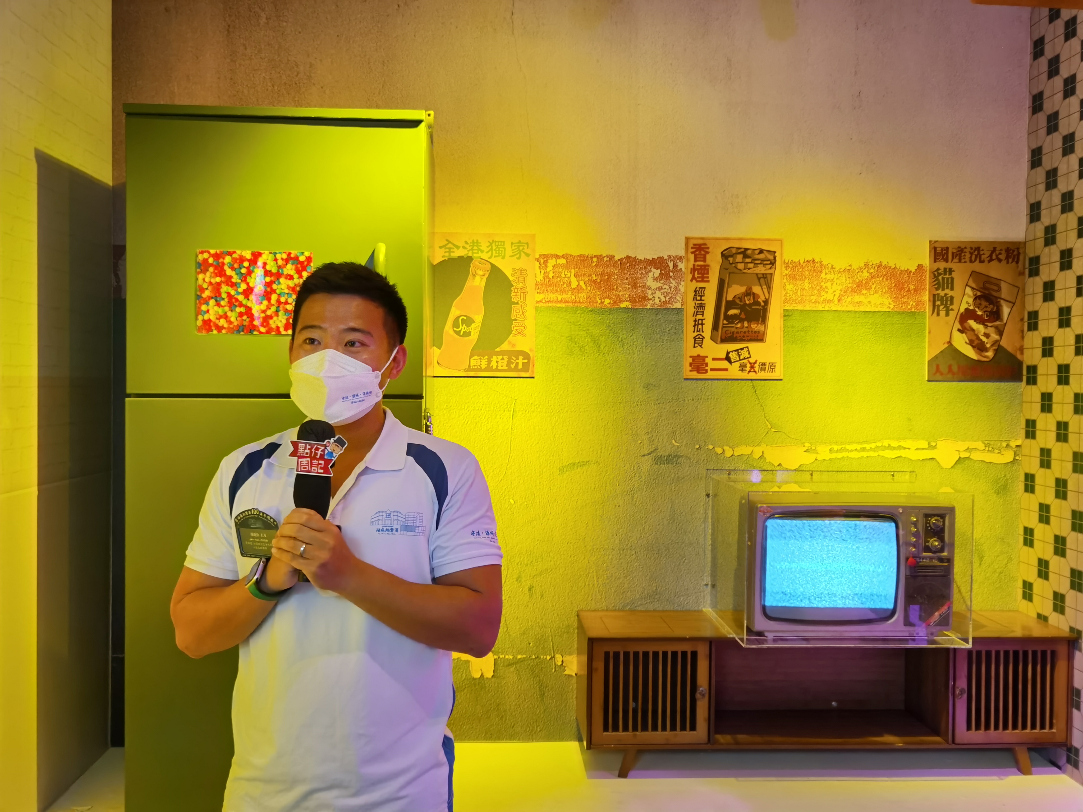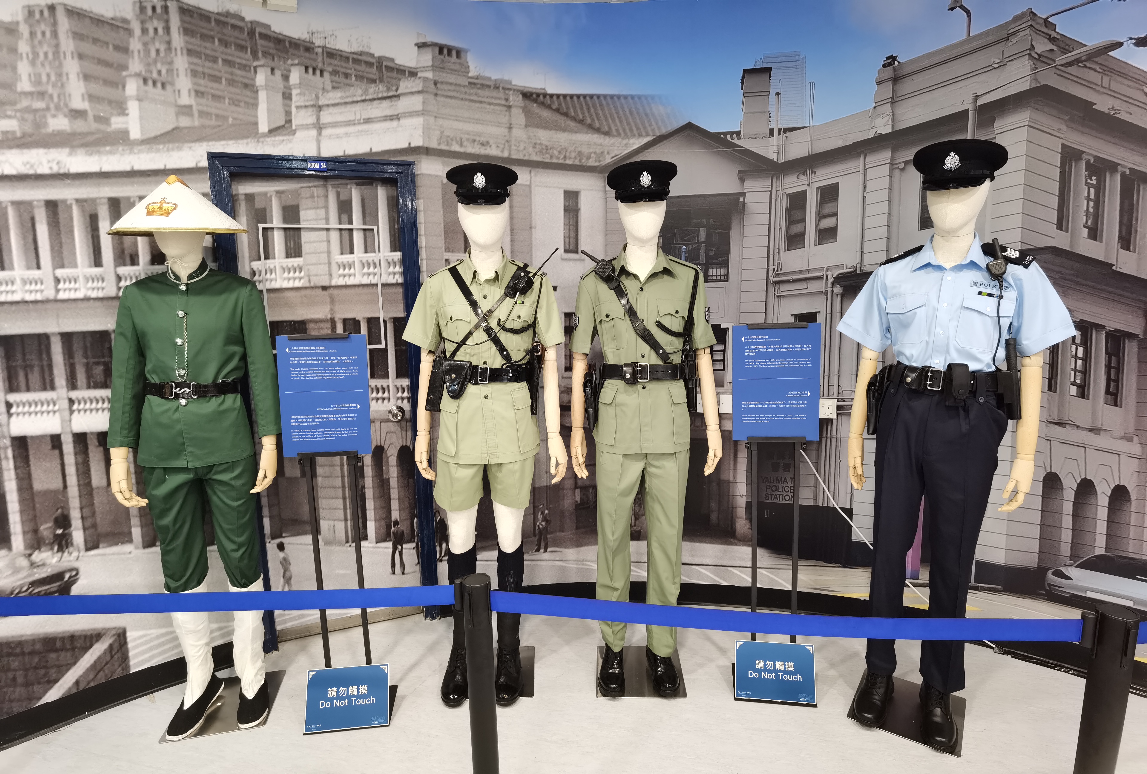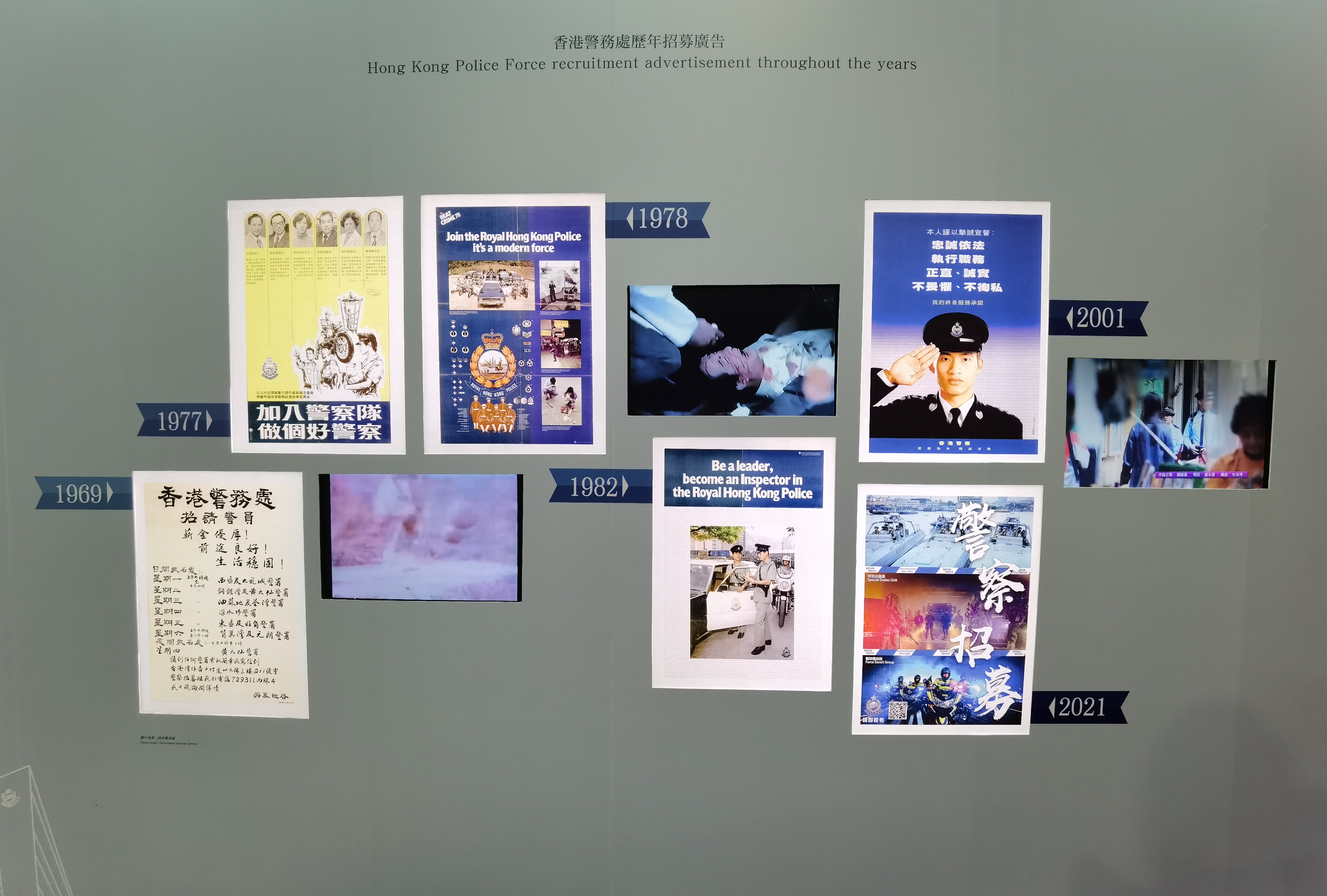 走入大門,映入眼簾的是地面上的舊時油麻地社區圖,以及貼有自1969年至2021年的香港警務處歷年招募廣告。陳曉馳表示,1969年招募警員的廣告注重強調薪金和前途,隨着時代的發展,警隊以服務為本,之後的招募廣告則注重強調服務市民、不畏懼、不徇私的精神,2021年的招募廣告則注重突出警隊不同部門和角色,希望吸引市民加入警隊。