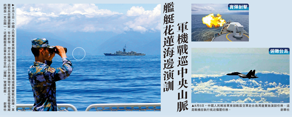 大公報綜合中新社、澎湃新聞報道,中國人民解放軍東部戰區8月6日繼續在台島北部、西南、東部海空域進行實戰化聯合演訓。在戰區聯合作戰體系支撐下,戰區海軍出動艦艇、戰機、岸導等任務兵力,重點進行了聯合對陸打擊、對海突擊等課目訓練。而據官媒發布的解放軍艦機5日演訓視頻、照片顯示,執行任務的軍艦可能已逼近台島花蓮一帶海岸線,而戰機已可俯瞰島上中央山脈。