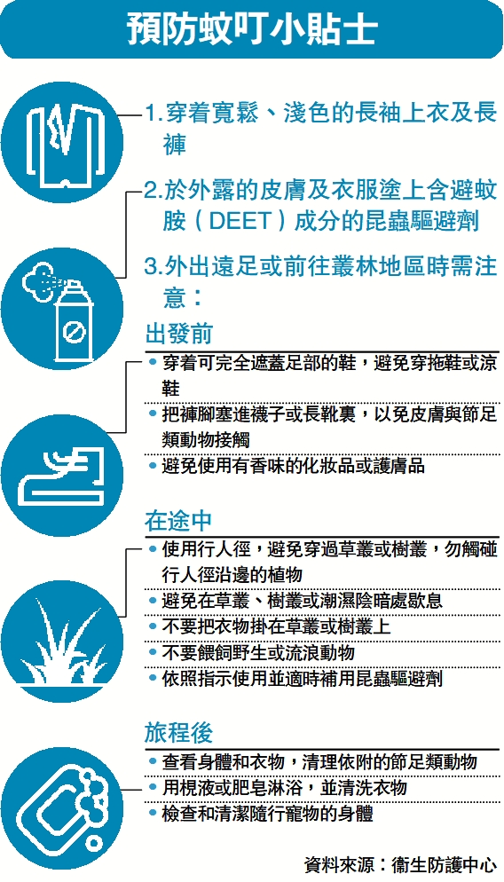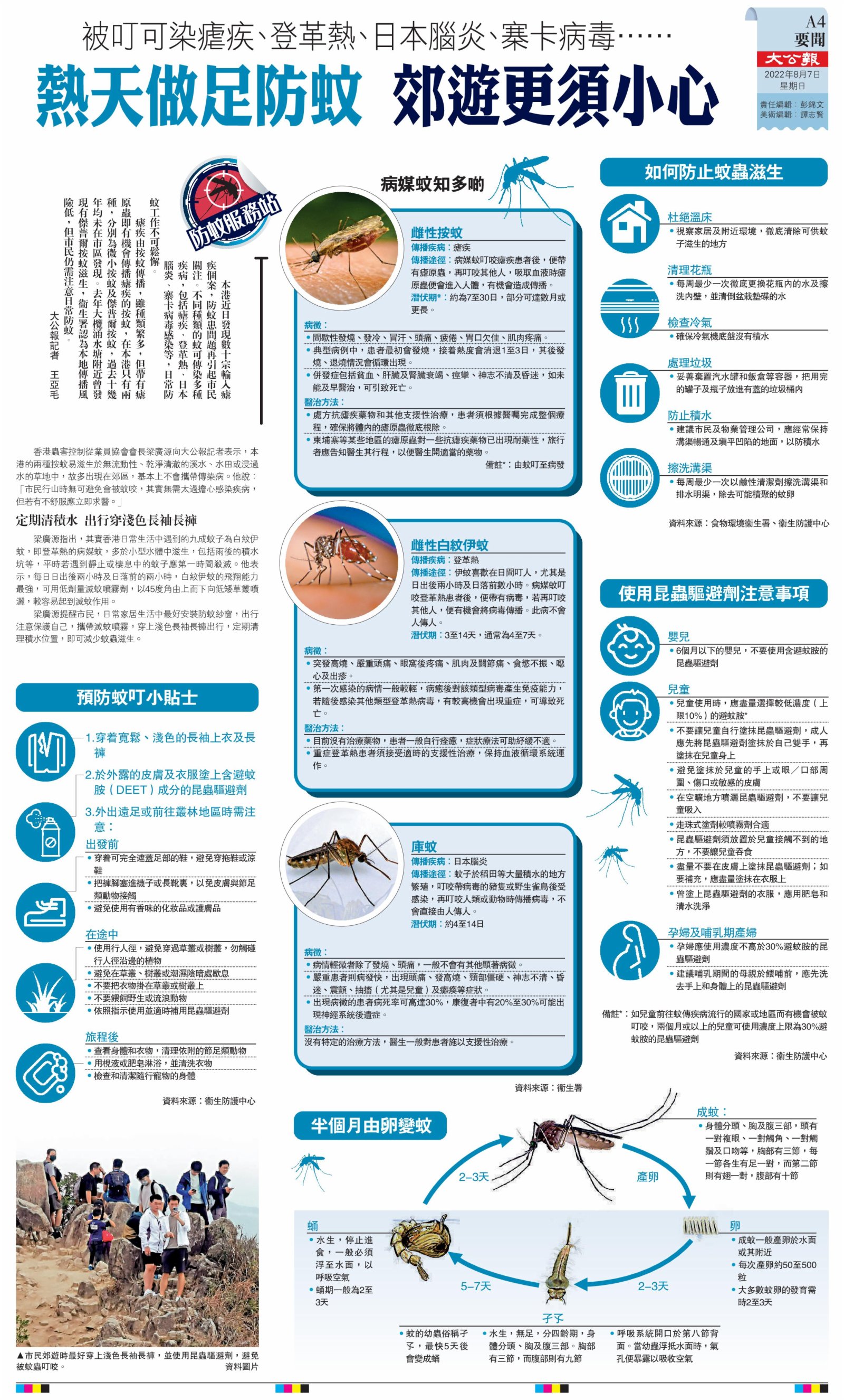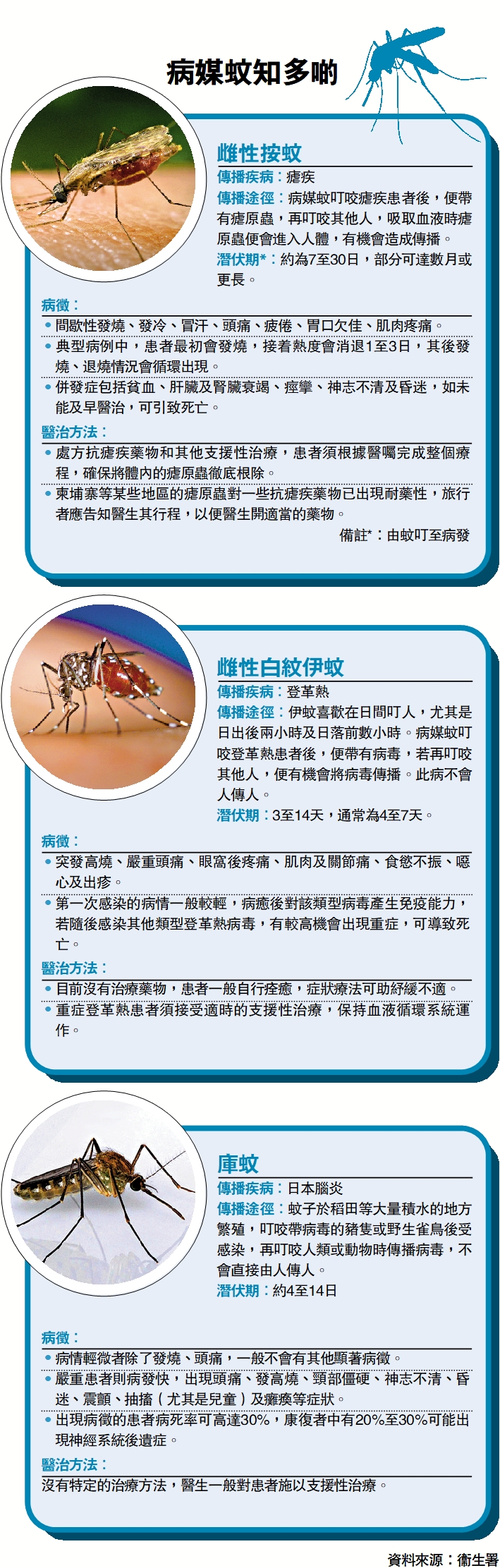 (大公報 記者 王亞毛)本港近日發現數十宗輸入瘧疾個案,防蚊患問題再引起市民關注。不同種類的蚊可傳染多種疾病,包括瘧疾、登革熱、日本腦炎、寨卡病毒感染等,日常防蚊工作不可鬆懈。