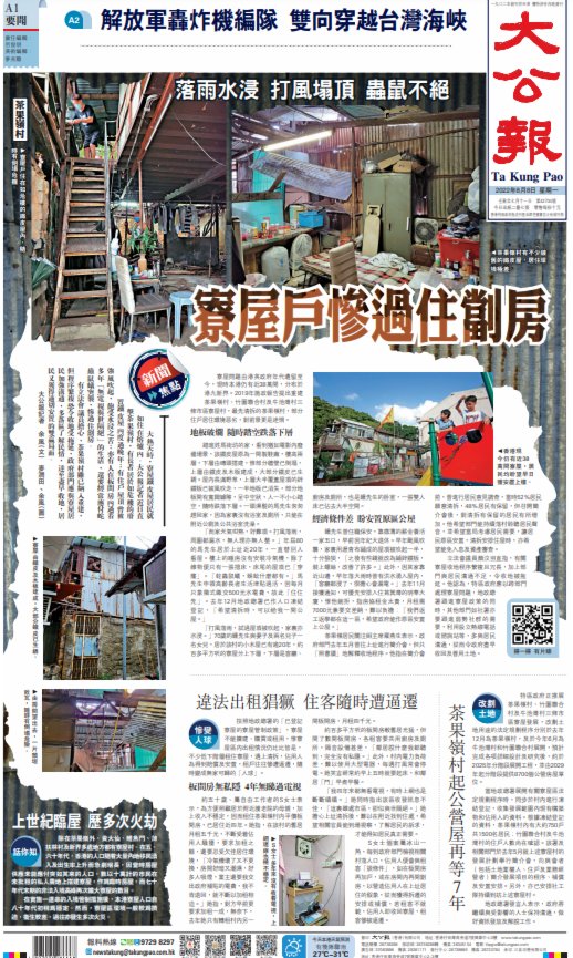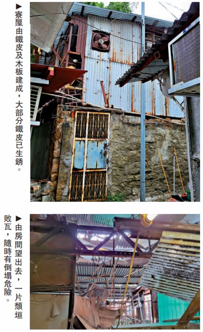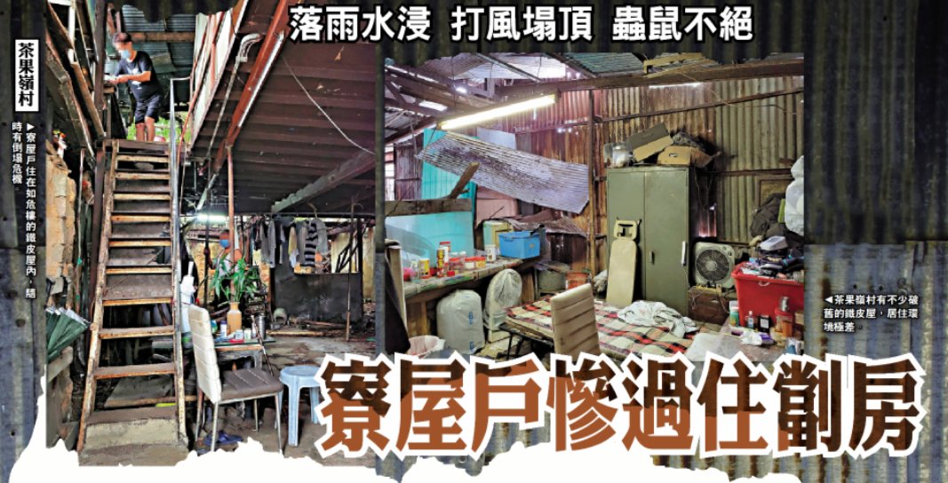 (大公報記者 余風<文> 麥潤田、余風<圖>)大熱天時,寮屋鐵皮屋居民就如住在熔爐內。大公報記者近日直擊茶果嶺村,有長者居於如危樓的廢置鐵皮屋內度過晚年;有住戶屋頂曾被強風吹起,飽受水浸之苦;亦有人在板間房內過着多年「無電視與世隔絕」的生活,還要經常應付蛇蟲鼠蟻突襲,慘過住劏房。