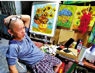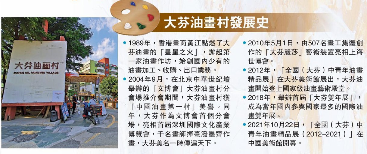 「大芬村在2004年獲得『中國油畫第一村』美譽後,吸引了更多人前來挖金,連村中小巷牆壁亦成為畫師的工作坊,且供不應求。」老鄧表示,高峰期與油畫相關的商家有近2000家,從業人員近20000人,產品遠銷至歐美、東南亞、非洲等幾十個國家和地區。