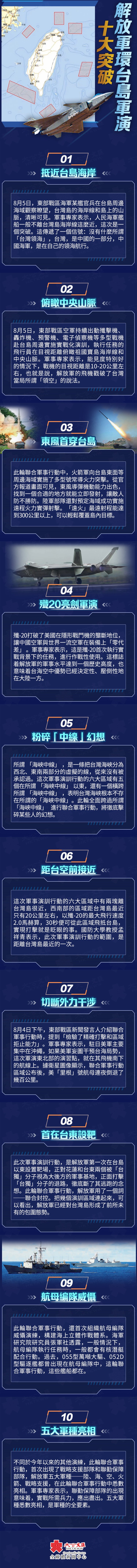 8月4日12時至7日12時,解放軍環台島六大區域軍演展開。8月7日,東部戰區繼續在台島周邊海空域進行實戰化聯合演訓,戰區空軍連續出動多批多型戰機,成體系實施島嶼進攻作戰演練,演練重點錘煉了聯合對地打擊和遠距空中打擊能力。包括多架「戰神」轟-6K在內的空中打擊兵力完成聯合精確打擊演練後,多支轟炸機編隊貫通南北同時雙向穿越台灣海峽,遂行多軍兵種環台島進逼懾壓。解放軍大規模、近距離、多軍種、高頻次、全天候的環台島軍演,刷新了多項紀錄,對「台獨」勢力形成了強大震懾。本輪解放軍環台島軍演,共有十大突破。
