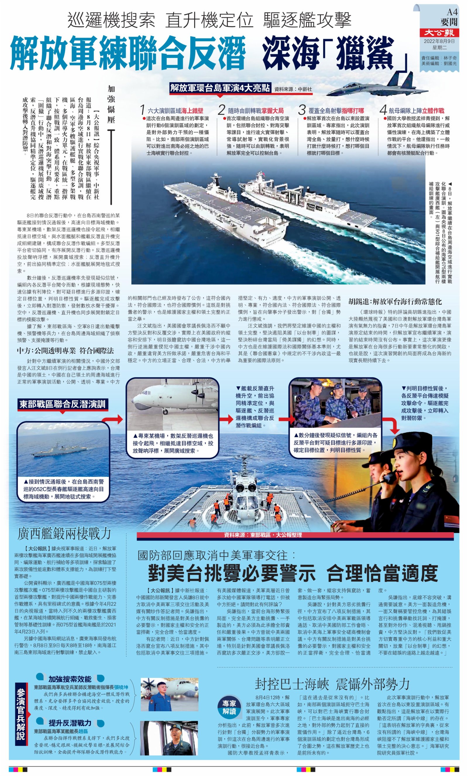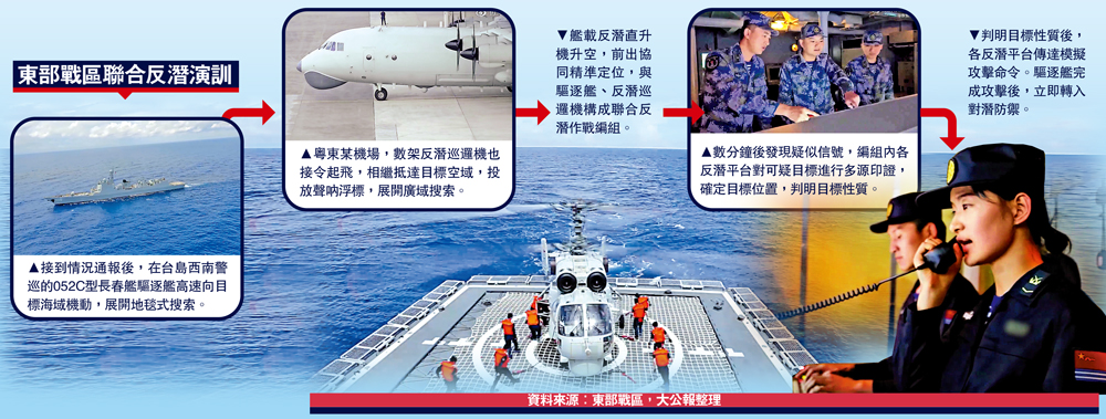大公報綜合央視軍事、中新社報道:8月8日,解放軍東部戰區繼續在台島周邊海空域進行實戰化聯合演訓,戰區海、空軍多艘驅護艦艇、多型多架戰機、多個岸導火力單元,在戰區統一指揮下,按照戰訓一致、體系用兵要求,重點組織了聯合反潛和對海突擊行動。反潛「圍獵」行動中,反潛巡邏機展開廣域搜索,反潛直升機協同精準定位,驅逐艦完成攻擊後轉入對潛防禦。