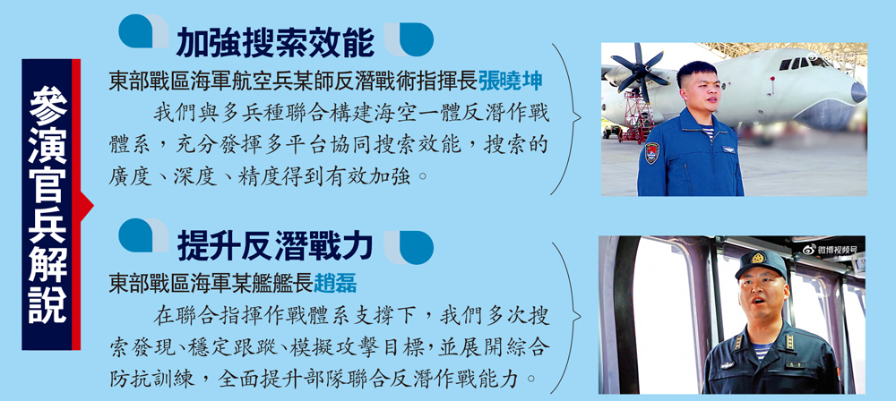 8日的聯合反潛行動中,在台島西南警巡的某驅逐艦接到情況通報後,高速向目標海域機動。粵東某機場,數架反潛巡邏機也接令起飛,相繼抵達目標空域,與水面艦艇和艦載反潛直升機完成組網建鏈,構成聯合反潛作戰編組。多型反潛平台密切協同,有序展開反潛行動。反潛巡邏機投放聲吶浮標,展開廣域搜索;反潛直升機升空,前出協同精準定位;水面艦艇展開地毯式搜索。