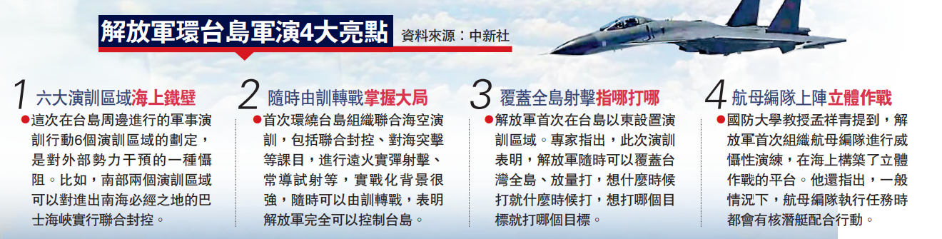 國防大學教授孟祥青表示,「這在過去是從來沒有的」。比如,南部兩個演訓區域扼守巴士海峽,可以對巴士海峽實行聯合封控。「巴士海峽是進出南海的必經之地,對外部的勢力起到了直接的震懾作用。」除了逼近台灣島,6個演訓區域的劃定也對台灣島形成了合圍之勢,這在解放軍歷史上也是前所未有的。