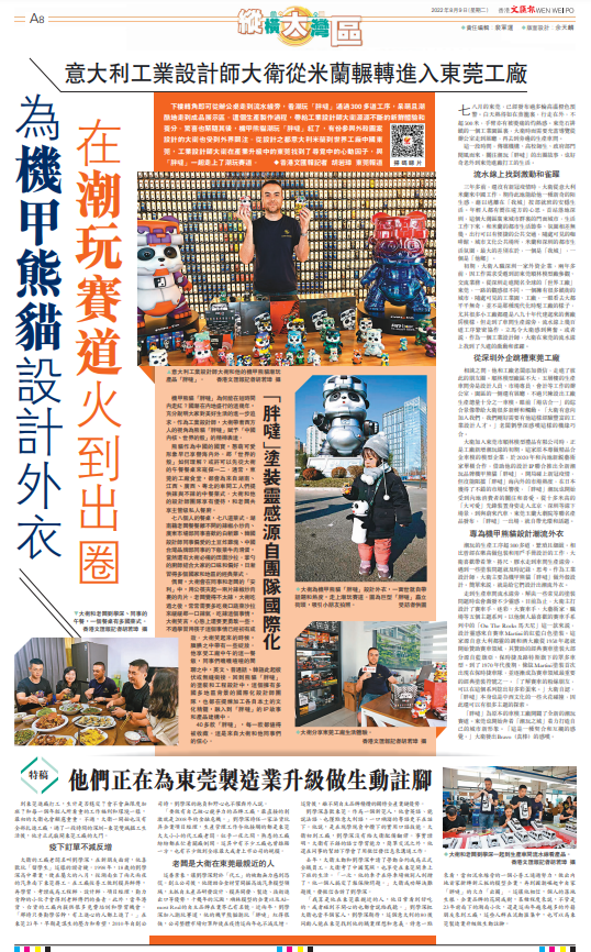 【香港文匯報記者 胡若璋 東莞報道】下樓轉角即可從辦公桌走到流水線旁,看潮玩「胖噠」通過300多道工序,呆萌且潮酷地走到成品展示區。這個生產製作過程,帶給工業設計師大衛源源不斷的新鮮體驗和養分。驚喜也緊隨其後,機甲熊貓潮玩「胖噠」紅了,有份參與外殼圖案設計的大衛也受到外界關注。從設計之都意大利米蘭到世界工廠中國東莞,工業設計師大衛在產業升級中的東莞找到了尋覓中的心動因子,與「胖噠」一起走上了潮玩賽道。