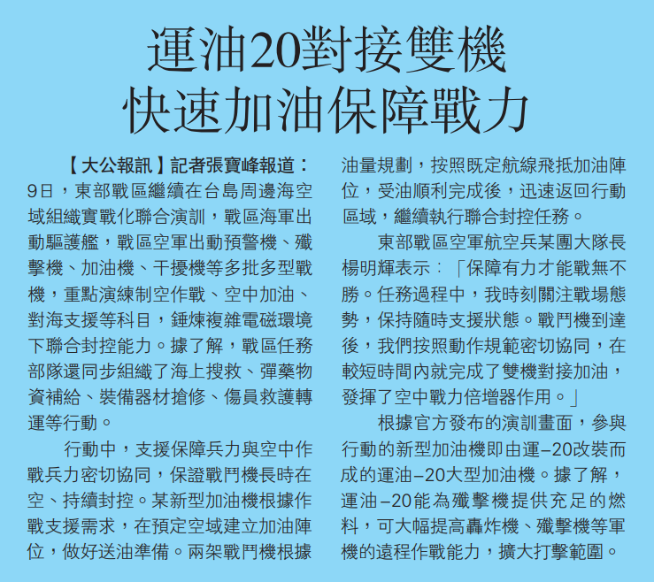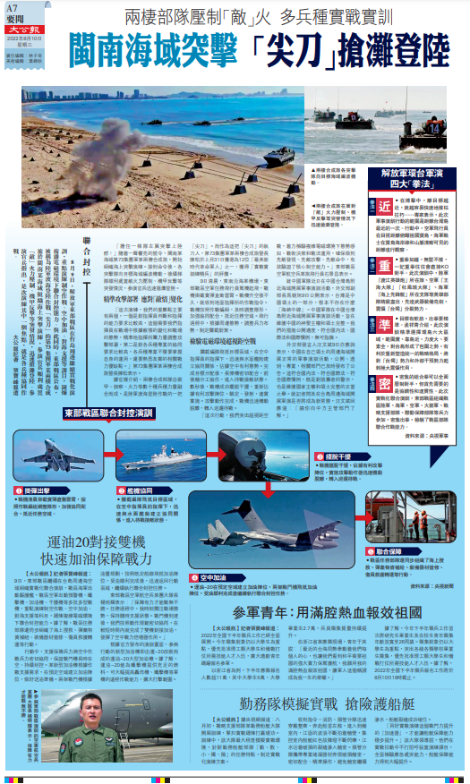 【大公報記者 張寶峰報道】8月9日,解放軍東部戰區在台島周邊繼續實戰化演訓,重點演練制空作戰、空中加油、對海支援等課目,錘煉複雜電磁環境下聯合封控能力。與此同時,東部戰區公布,被稱為陸軍渡海登陸作戰「尖刀」的第73集團軍某兩棲合成旅於閩南某海域組織海上突擊演練,參演官兵順利處置「敵」火力壓制、機甲反擊等突發情況,迅速搶灘登陸。參演官兵指出,是次演練其中一個焦點,就是各兵種協同作戰。