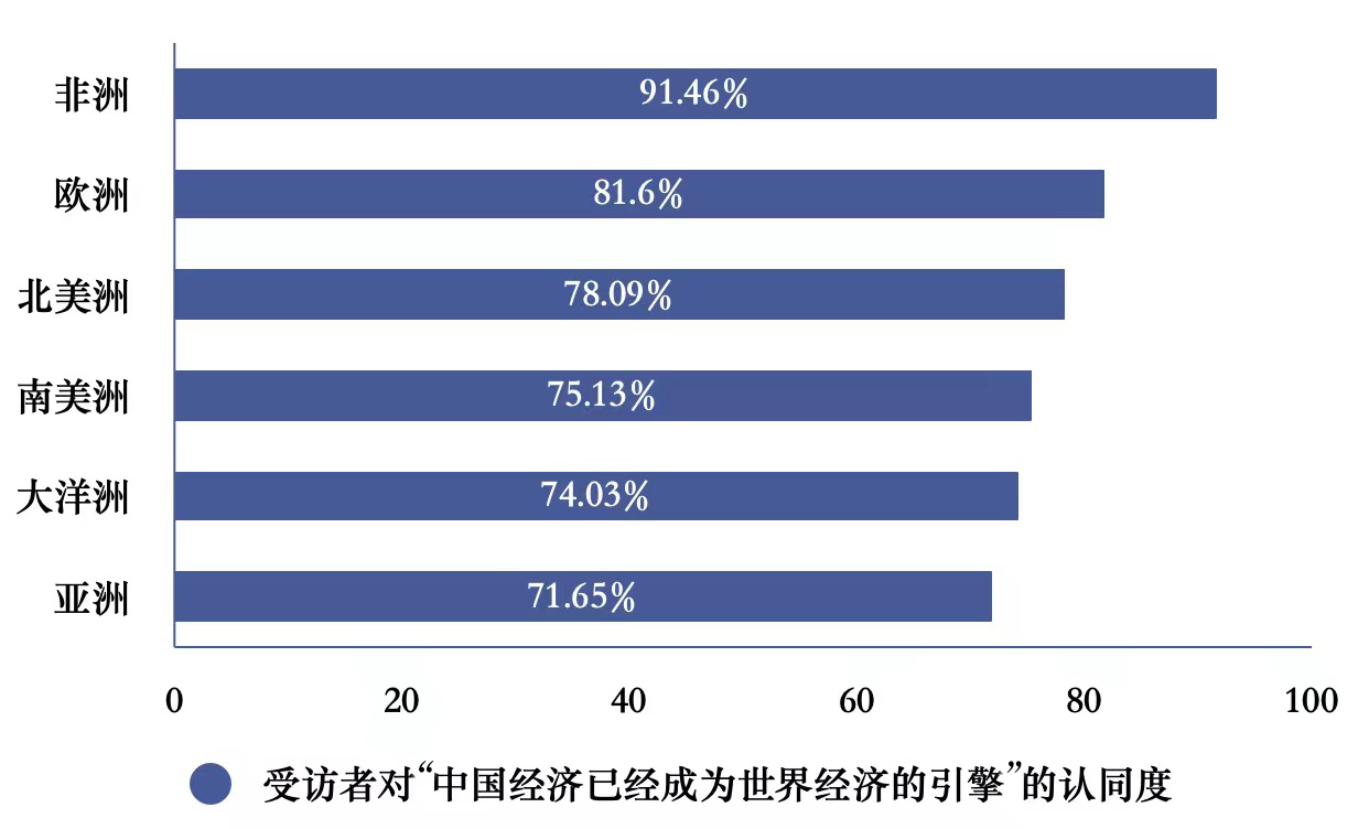 這項名為「新時代的中國」的全球民意調查,由中央廣播電視總台CGTN智庫聯合中國人民大學國家治理與輿論生態研究院共同發起。調查對象既包括美國、英國、法國、德國、加拿大、澳大利亞、新西蘭、日本、韓國、新加坡等發達國家的居民,也包括巴西、阿根廷、墨西哥、泰國、印度、巴基斯坦、阿拉伯聯合酋長國、埃及、尼日利亞、肯尼亚、南非等發展中國家的受訪者。結果顯示,對中國經濟成就高度讚賞的受訪者比例,在非洲高達91.46%。歐洲緊隨其後,佔比達到81.60%。北美洲位列第三,達到78.09%。