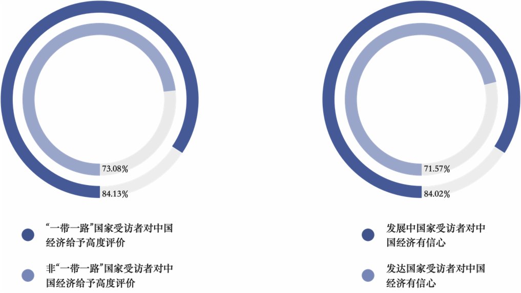 「一帶一路」沿線國家佔全世界人口超過六成,佔全球經濟總量約30%。此次調查顯示,「一帶一路」沿線國家對中國經濟給予高度評價的比例顯著高於非「一帶一路」國家,達到84.13%。與發達國家相比,發展中國家的受訪者在調查中表現出對中國經濟更強烈的信心,佔比達到84.02%。