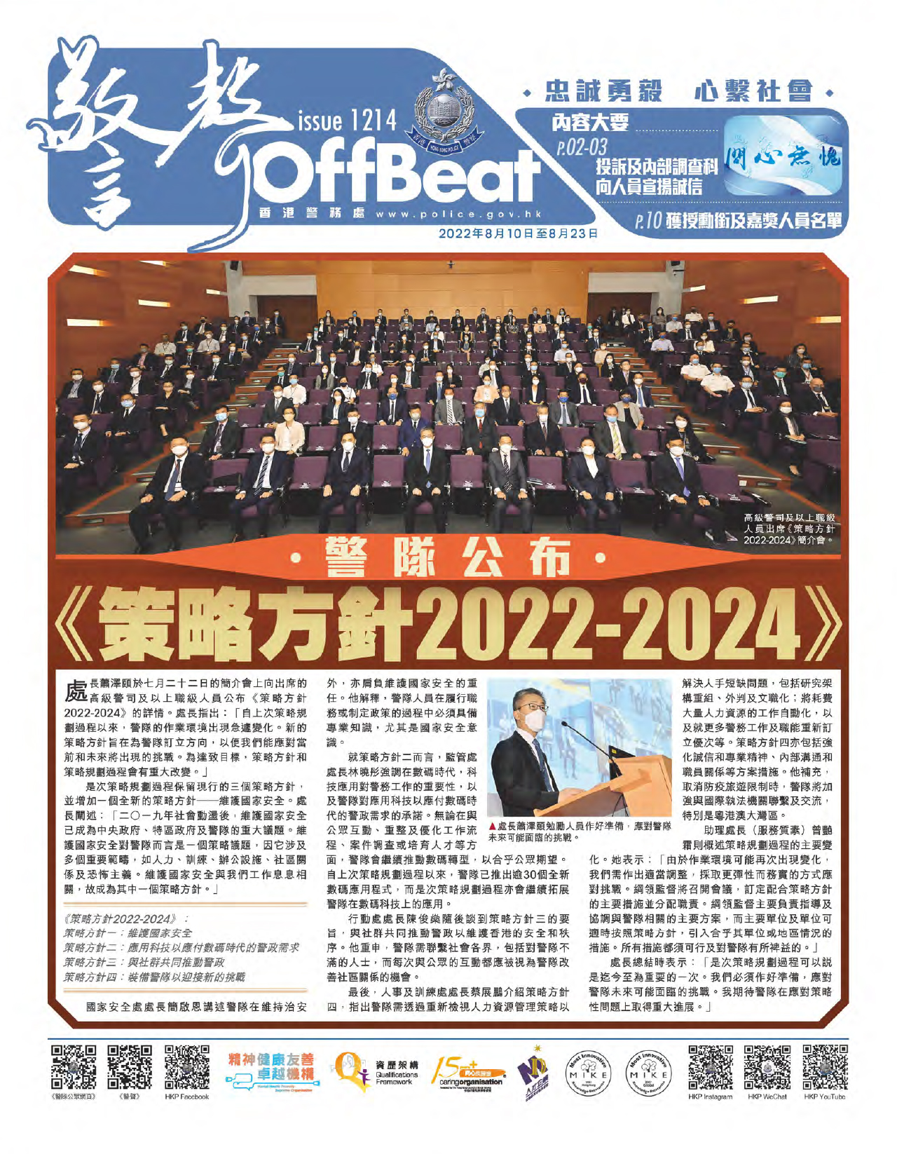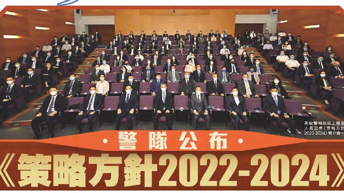 大公文匯全媒體報道,警方表示,新一期警隊刊物《警聲》今日(10日)出版。當中頭版報道警務處處長蕭澤頤7月22日向出席的高級警司及以上職級人員公布《策略方針2022-2024》的詳情。