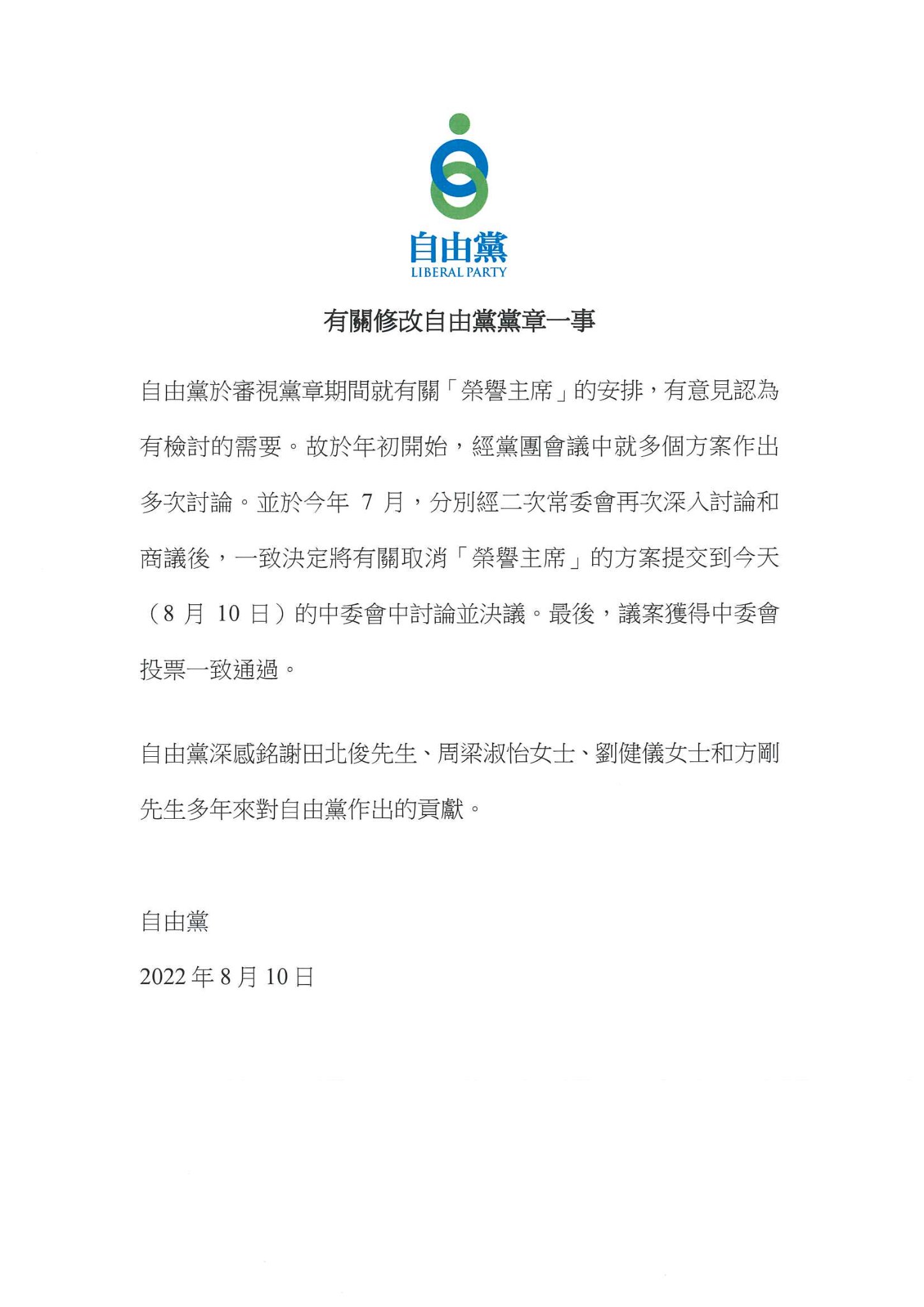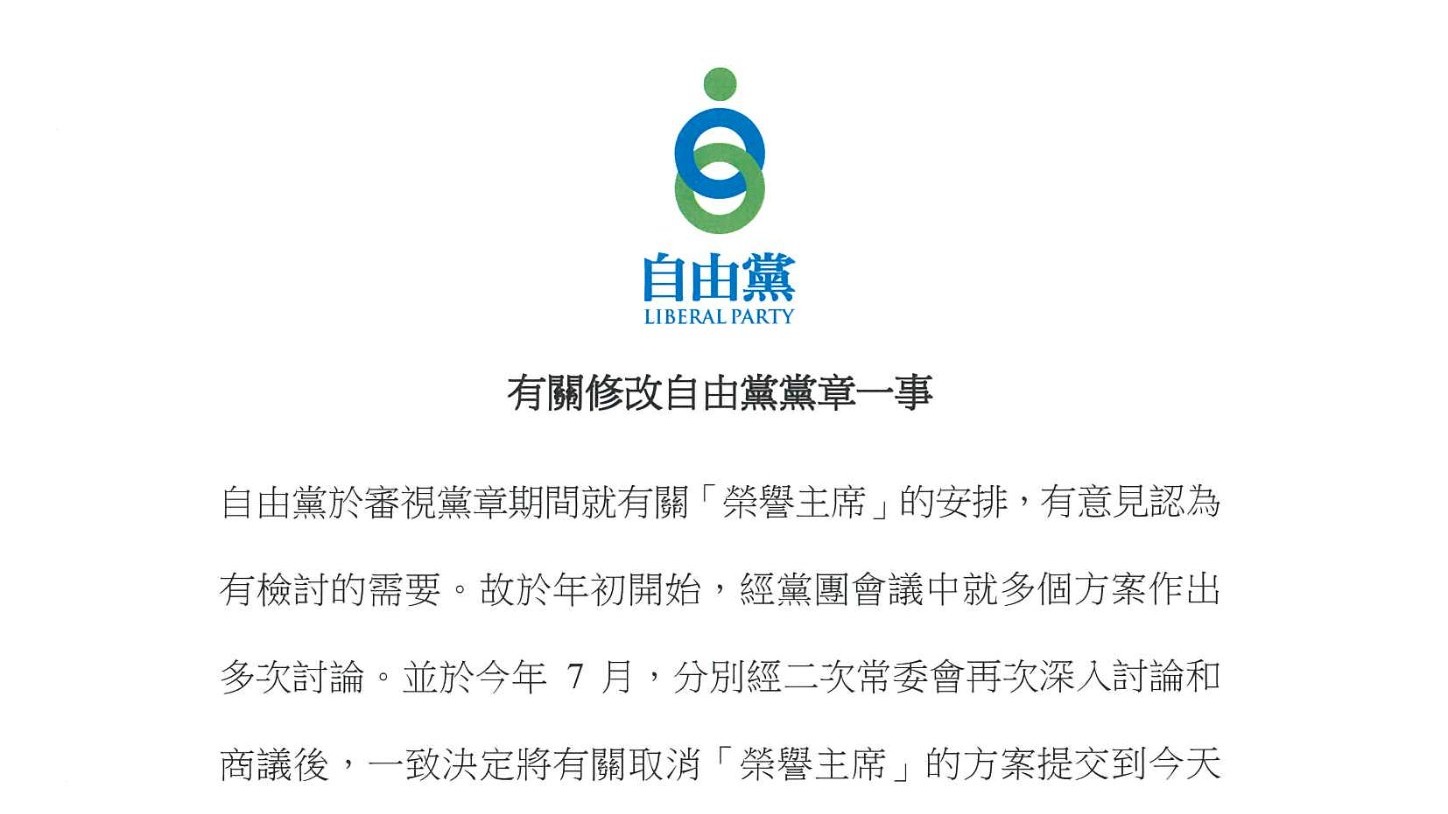 大公文匯全媒體報道,自由黨今日(10日)發表聲明,指於審視黨章期間就有關「榮譽主席」的安排,有意見認為有檢討的需要。故於今年初開始,經黨團會議中就多個方案作出多次討論,並於今年7月,分別經二次常委會再次深入討論和商議後,一致決定將有關取消「榮譽主席」的方案提交到今天的中委會討論並決議。最後,議案獲得中委會投票一致通過。