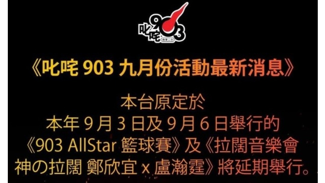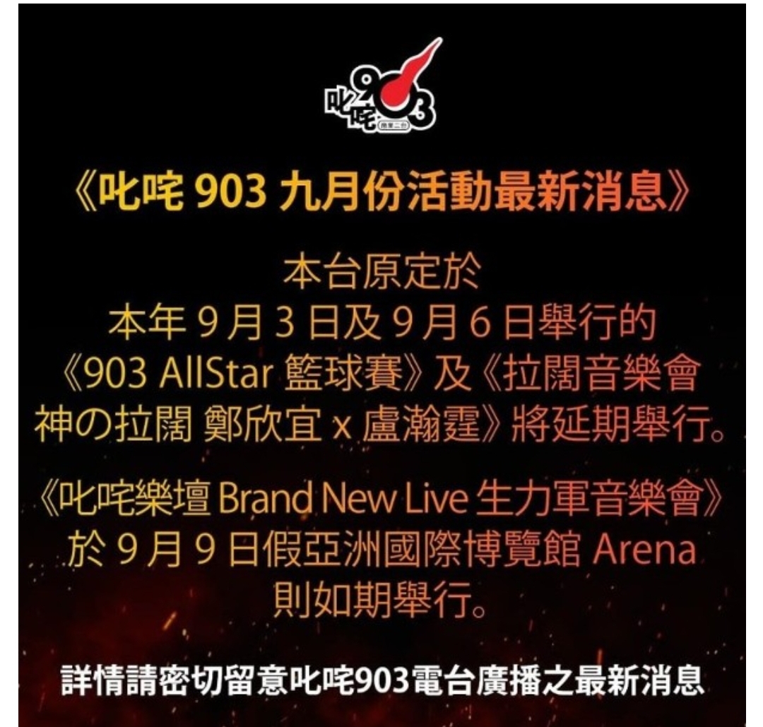 MIRROR成員工作更全部停頓,下月除了參加電台舉辦的籃球賽外,Anson Lo與鄭欣宜的拉闊音樂會亦等待舉行。但是,叱咤903剛於社交網發出公告指出:「本台原定於本年9月3日及9月6日舉行的《903 AllStar籃球賽》及《拉闊音樂會 神の拉闊 鄭欣宜x 盧瀚霆》將延期舉行。《叱咤樂壇Brand New Live生力軍音樂會》於9月9日假亞洲國際博覽館Arena則如期舉行。」