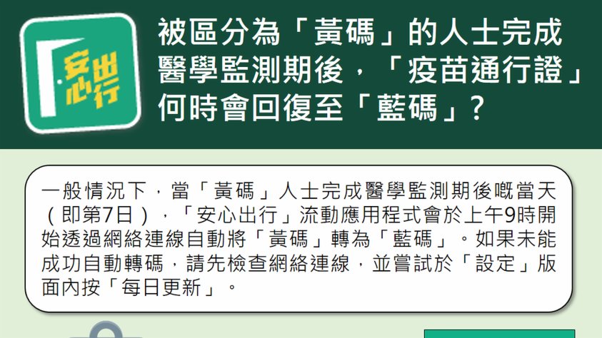 政府強調,如果未能成功自動轉碼,請先檢查網絡連線,並嘗試於「設定」版面內按「每日更新」。如需協助,可致電「安心出行」服務熱線2626 3066,職員每日早上7點至晚上9點提供協助。