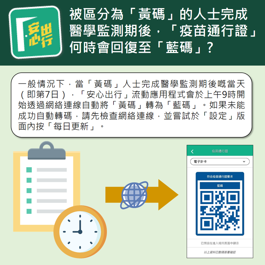 政府舉例說明,如在8月12日抵港,抵港當天為第零日,在指定檢疫酒店檢疫至第3日,其後醫學監察至第7日(8月19日)。一般情況下,當「黃碼」人士完成醫學監測期後的當天(即第7日),「安心出行」流動應用程式會於上午9時開始,透過網絡連線自動將「黃碼」轉為「藍碼」。
