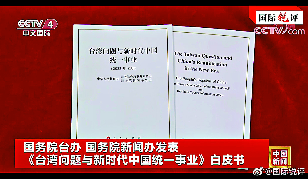 大公文匯全媒體報道,中央政府昨日(10日)發表《台灣問題與新時代中國統一事業》白皮書。白皮書提到,台灣自古屬於中國的歷史經緯清晰、法理事實清楚;「挾洋謀獨」沒有出路,「以台制華」注定失敗;希望廣大台灣同胞堅定站在歷史正確的一邊,做堂堂正正中國人。白皮書強調,祖國完全統一的歷史任務一定要實現,也一定能夠實現!