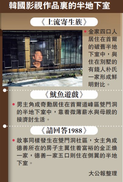 《紐約時報》指出,在首爾,住在三星和現代等韓國企業集團建造的高層公寓樓裏是一種身份的象徵。但窮人蝸居在廉價的半地下室,他們努力找工作、存錢、教育孩子,希望克服日益嚴重的不平等。