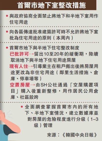 在民眾的質疑聲中,首爾市政府10日發布了「地下與半地下住戶安全對策」。首爾市將與中央政府協商修改「建築法」,規定地下和半地下室不能被用作居住用途。首爾市政府將在本周向25個區傳達原則性指示,要求各區在進行建築許可審查時「不允許把地下室作為居住用途」。